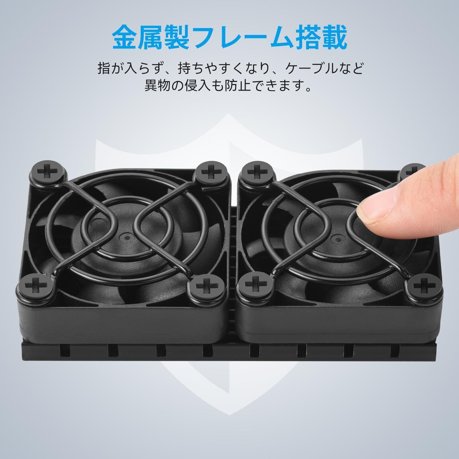 【安全設計】金属製フレーム搭載(一面のみ)、稼働中ケガ防止のため安全設計されます。指が入らず、持ちやすくなり、ケーブルなど異物の侵入も防止できます。USBポートに挿したら勝手に動作するようになっています。