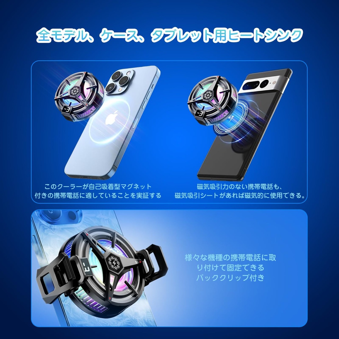 スマホ 冷却ファン 2025年最新 磁気&クリップ式 スマホ 冷却ファン 静音 アプリ制御 スマート温度調整/風量調整 コンパクト設計 Type-c 給電式 iPhone Android 対応 ゲームプレイに/写真撮影・動画鑑賞/リモートワーク/生放送最適 黒