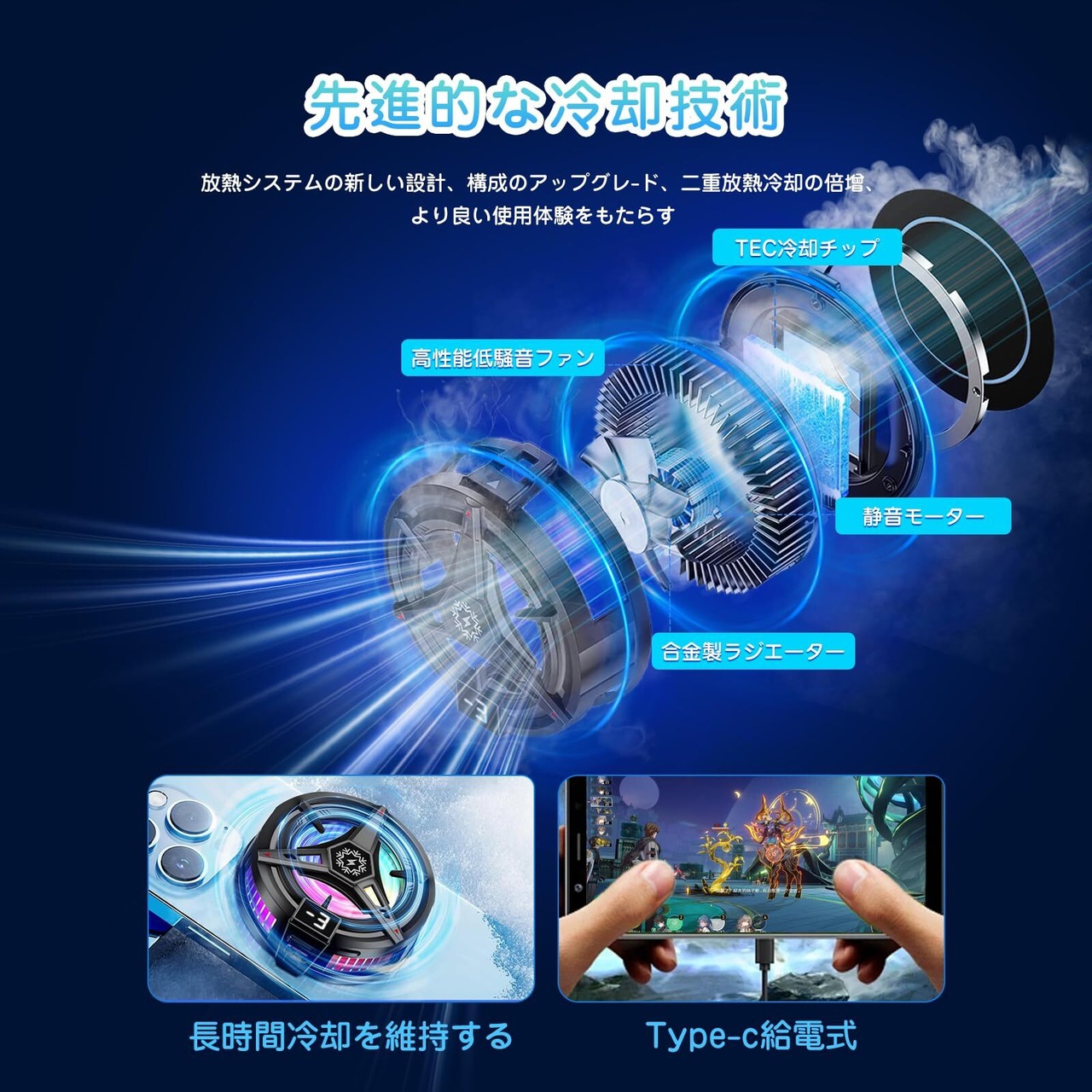 【品質】本製品は12ヶ月のメーカーに加え、万が一の際には24時間以内の迅速なカスタマーサポートを提供します。セット内容:冷却器本体×1、Type-C充電ケーブル×1、ユーザーマニュアル×1、磁気シート×1、グリップ×2。
