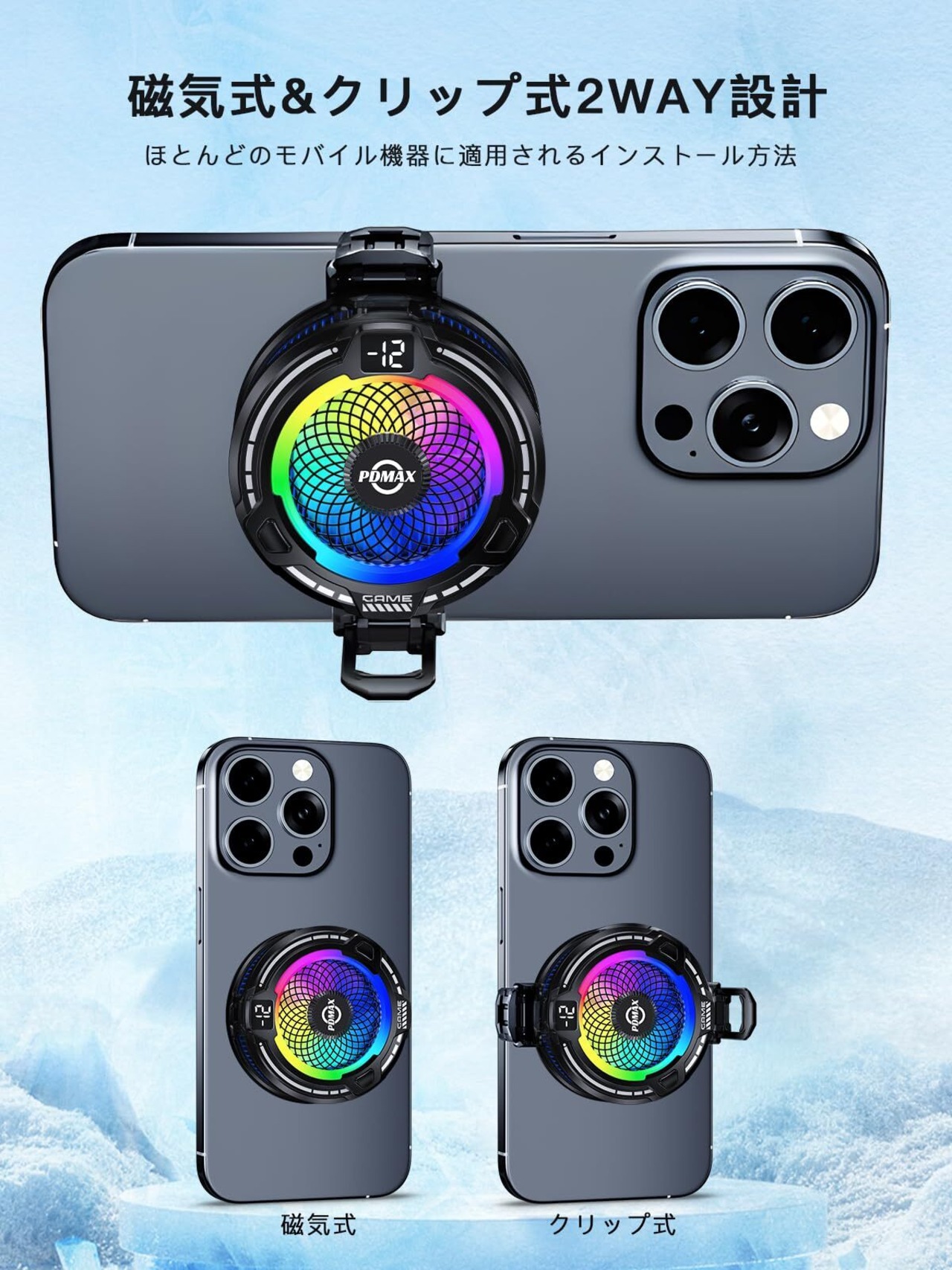 【超薄型スマホクーラー】AI知能温控で急速冷却!スマホ冷却ファン 磁吸式/クリップ式対応 1分間で氷点下!スマホの熱暴走をストップ : ゲームや長時間使用でスマホ冷却が必須のあなたへ。スマホクーラーは、スマホ冷却ファンの常識を覆す薄型設計と驚異の冷却性能を実現。iPhone 冷却はもちろん、Android/Switch/iPad/switch 2 冷却ファンまで幅広く対応します!