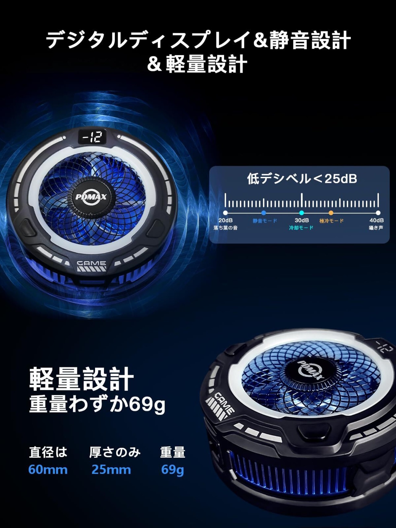 【軽くて薄い!ストレスフリー設計】 驚異の69g・薄型設計!冷却ファンの本体のサイズは60mm(幅)×60mm(奥行き)×25mm(高さ)です。手元の操作スペースを広く確保し、長時間のゲームでも疲れません。静音モード(わずか25db)採用! 深夜のゲームや動画視聴も周囲を気にせず没頭可能。