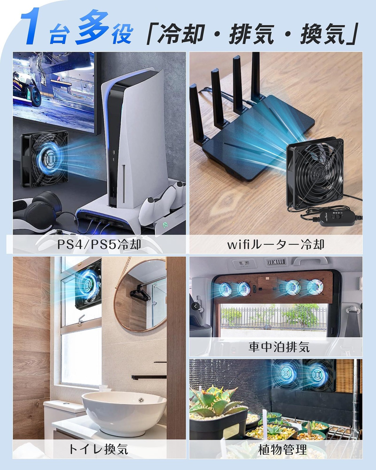 ✿外付けHDD、ルーター、AV機器、スマフォ、PS4ゲーム機などの電子機器を冷やすために設計された冷却扇風機であり、回路基板に熱がこもって発生する熱暴走を未然に防止します。卓上扇風機として、車中泊、空気の循環などのシーンにもご利用いただけます。