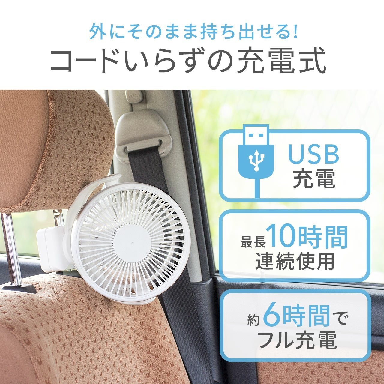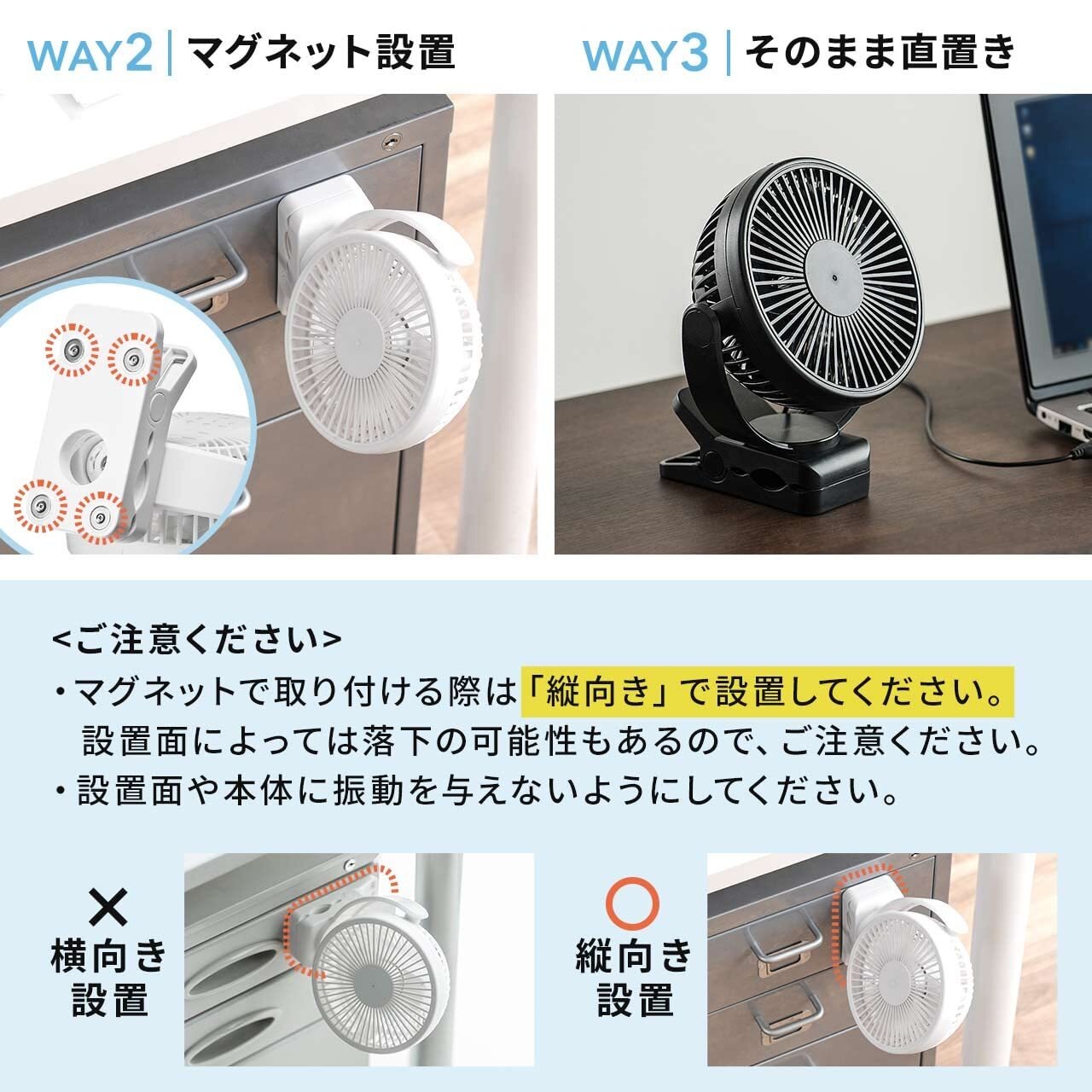 サンワダイレクト USB扇風機 充電式 マグネット/クリップ/直置き 設置 3段階風量 タイマー付き 360° 静音 ホワイト 400-TOY039W