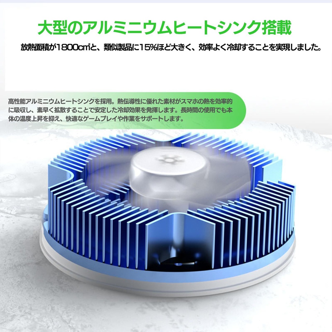 ❄️[高性能ペルチェ素子による、わずか3秒の即時冷却] スマホ 冷却ファンには、1800mm²の大型カスタムペルチェ素子を搭載しています。これにより、冷却接触面積が大幅に拡大され、従来品と比べて高い電流耐性と安定性を実現しました。最大20W出力の冷却システムにより、電源を投入してからわずか3秒で冷却が開始され、発熱するスマートフォンを迅速に温度低下へ導きます。また、冷却性能をさらに高めるために、熱伝導率に優れたアルミ製の放熱フィンを採用。ペルチェ素子で吸収された熱を効率的にフィン全体へと伝導し、ヒートシンク全体で均等に熱を拡散。背面ファンによる排熱効率を高め、全体としての冷却性能を大幅に向上させています。