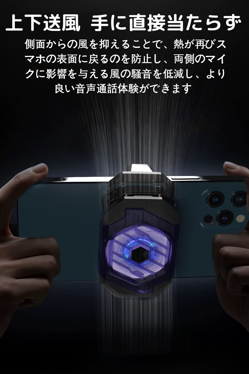 【上下出風口設計、手を吹かない】従来品の冷却ファンの出風モードは上下左右から熱気を吹き出すため、momofly は上下方向の垂直風路を採用した同時、熱量の二次循環を防止する効果的な散熱器の背面カバーを使用しました。また、ほとんどのスマホマイクはスマートフォンの両側やカメラ周辺にあり、上下方向の出風口設計により、マイクに風が当たって騒音が発生することを効果的に防止することができます。