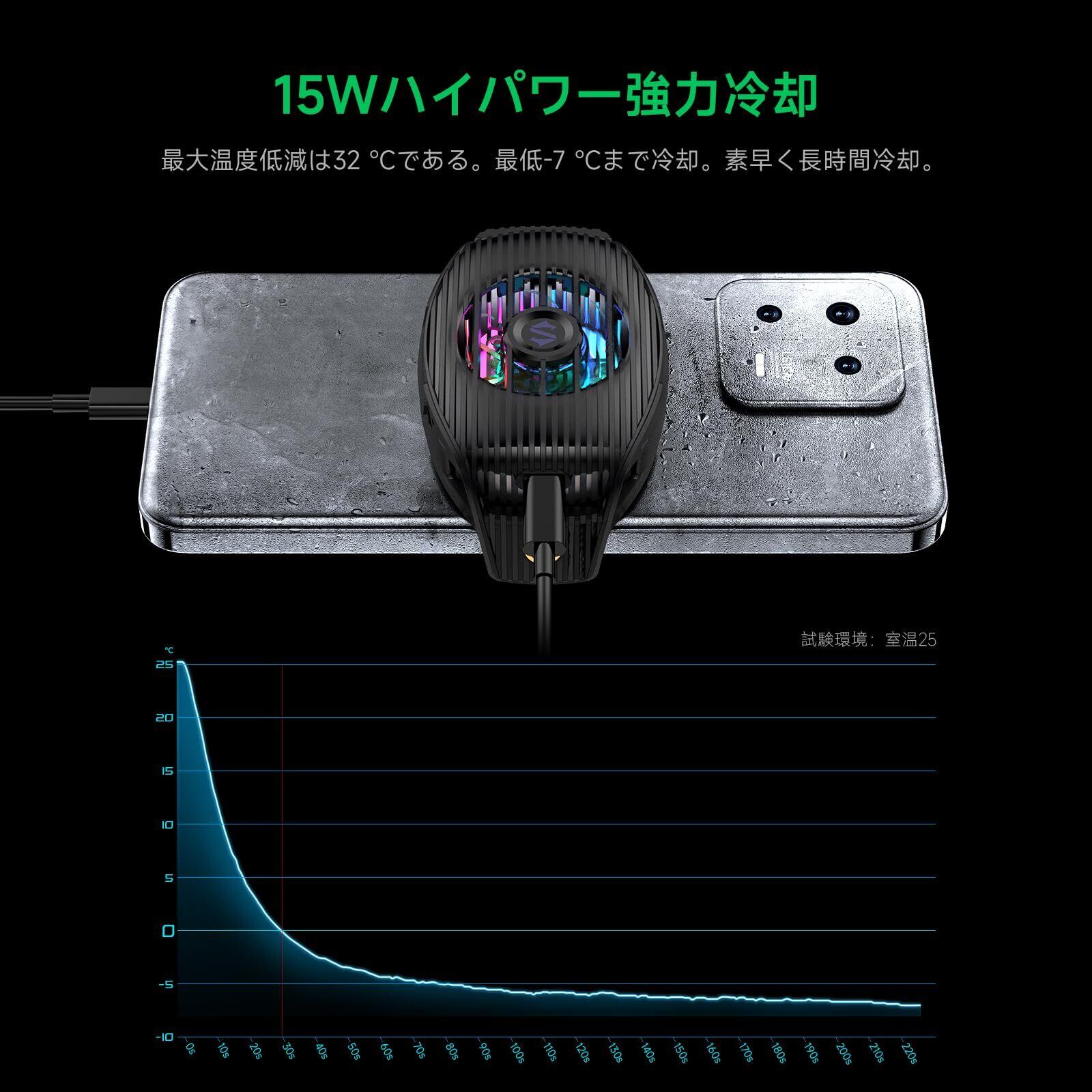 【15Wパワー超高速冷却】高性能ペルチェ素子(TEC) を採用したスマホクーラー、本体温度を約32℃温度を下げる放熱能力。大きな接触面と、ささやくような静かな7枚のファンで瞬時の冷却を実現しています。 注:使用には電源への接続が必要。データケーブルはパッケージに含まれていません。
