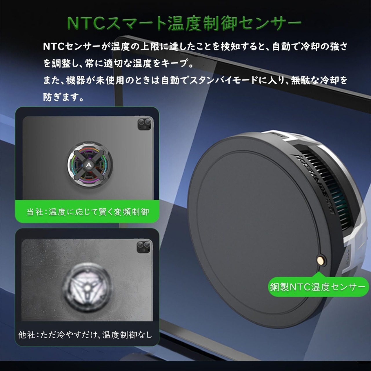 【NTC温度センサー搭載による自動温度制御で安心・省エネ設計】 タブレット 冷却ファンには、NTC温度センサーを搭載。端末や本体の温度をリアルタイムで検知し、設定された温度閾値に達すると自動でファンの回転数を調整する変頻制御を行います。これにより、必要な冷却を的確に行いながらも、過剰な稼働を抑えて省エネルギーかつ静音性を維持。さらに、端末が使用されていない待機状態では冷却ファンも停止し、機器の負荷軽減と長寿命化に寄与します。温度に応じたスマートな運転で、安定した動作環境をサポートする機能です。