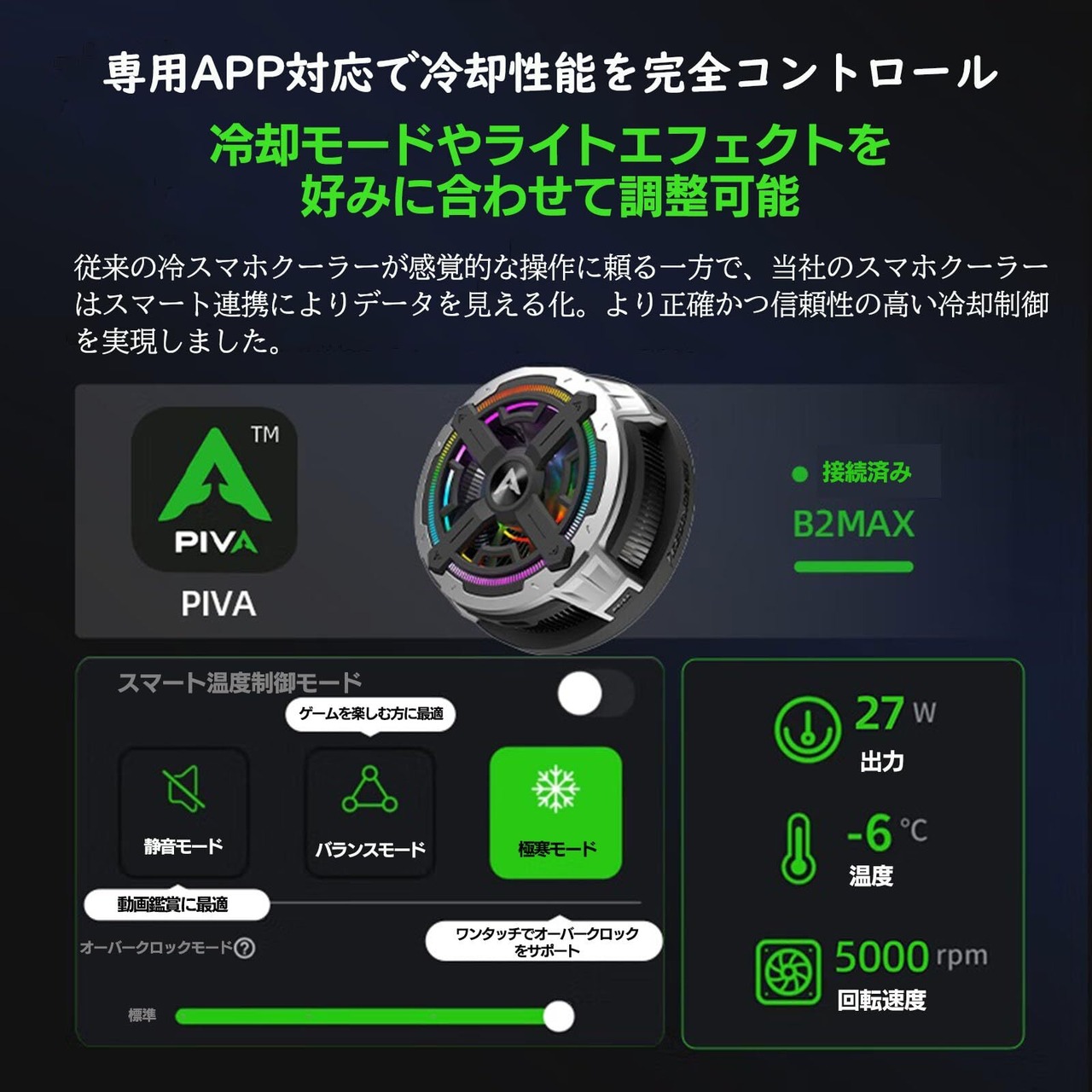 【多彩なライト演出と3段階冷却モードで自由にカスタマイズ】本製品は、使用シーンや好みに応じて切り替え可能な3種類の冷却モード(静音・均衡・極寒)を搭載。静かな環境では静音モードで気にならず、負荷の高い作業時には極寒モードでしっかりと冷却を行います。また、7種類のライトモード(流光・呼吸・追逐・缓冲・常亮・星环・灵动)に対応し、好みや気分に合わせて多彩なイルミネーションを楽しめます。ゲームや作業環境に彩りを添えながら、機能性とデザイン性の両立を実現しています。スマートフォンアプリからも直感的に操作できるため、冷却性能と演出のカスタマイズを自由自在に行えます。