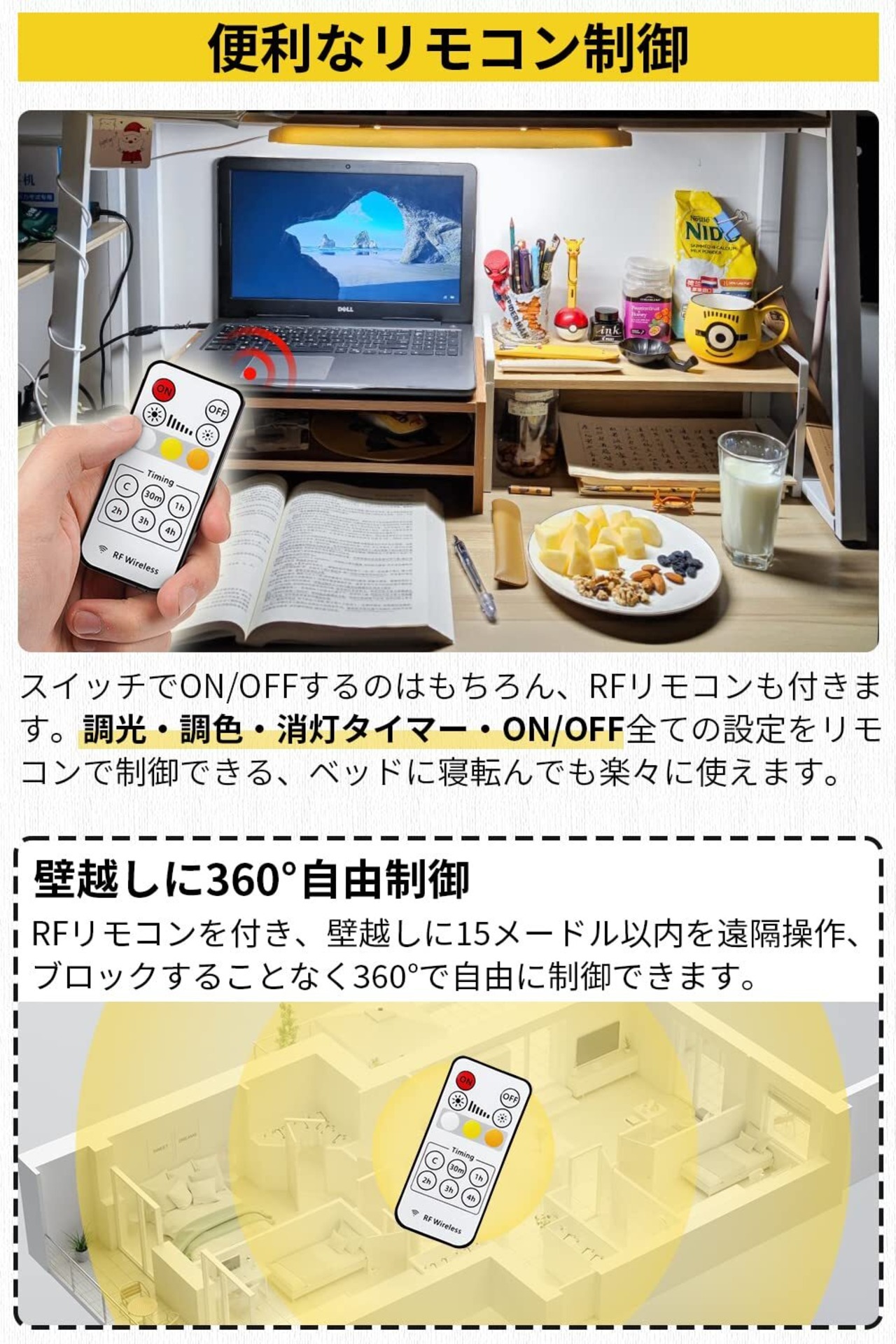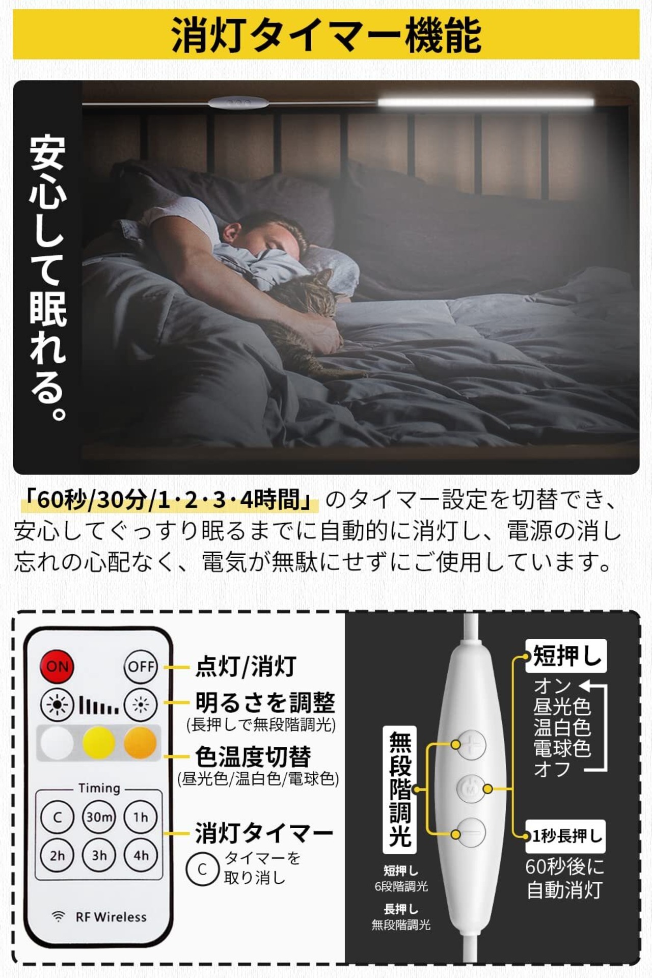 【360°制御リモコン・タイミング機能】RFリモコンを付き、壁越しに15メードル以内を遠隔操作、ブロックすることなく360°で自由に制御できます。すべての操作をリモコンで制御でき、ベッドに寝たままで手軽に使えます。消灯タイマー機能を備えており、リモコン操作で30分/1·2·3·4時間、スイッチ操作で60秒のタイマー設定を切替えます。安心してぐっすり眠るまでに自動的に消灯し、消し忘れの心配もなく、睡眠に役立ちます。