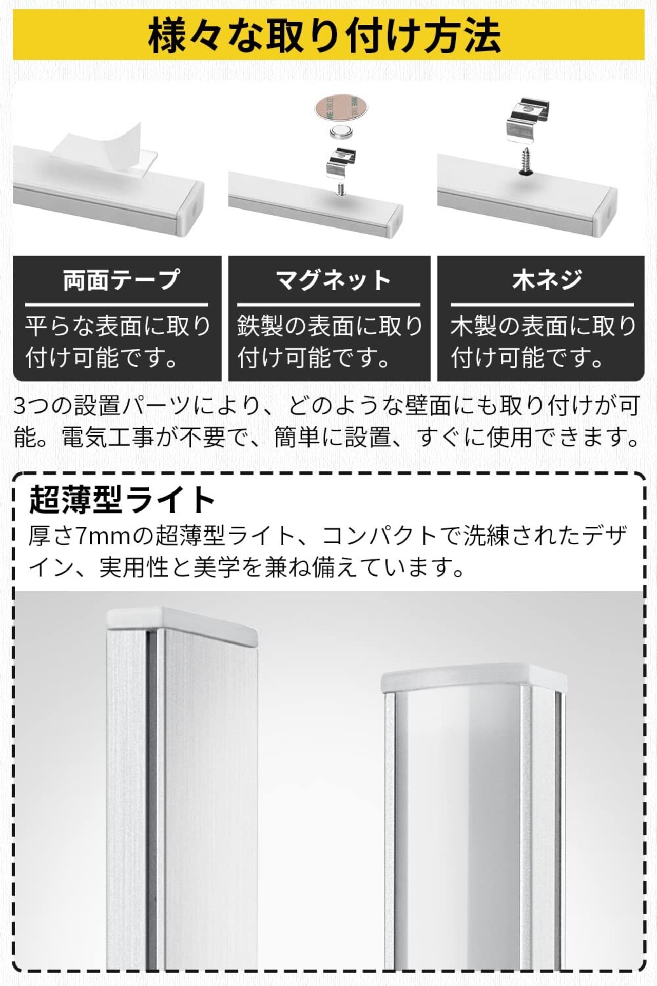 【マグネット付き・工事不要】磁石取付、両面テープ取付、木ネジ取付の3種類取り付け方法で、どんな面にも簡単に貼り付けられます。ケーブルクリップも入り、ケーブルの整理に活用できます。キャビネット、クローゼット、ベッド、寝室、地下室、ガレージ、キャビネット、本棚、戸棚、倉庫、車中泊、読書灯、部屋照明などいろんな場所でご利用頂けます。