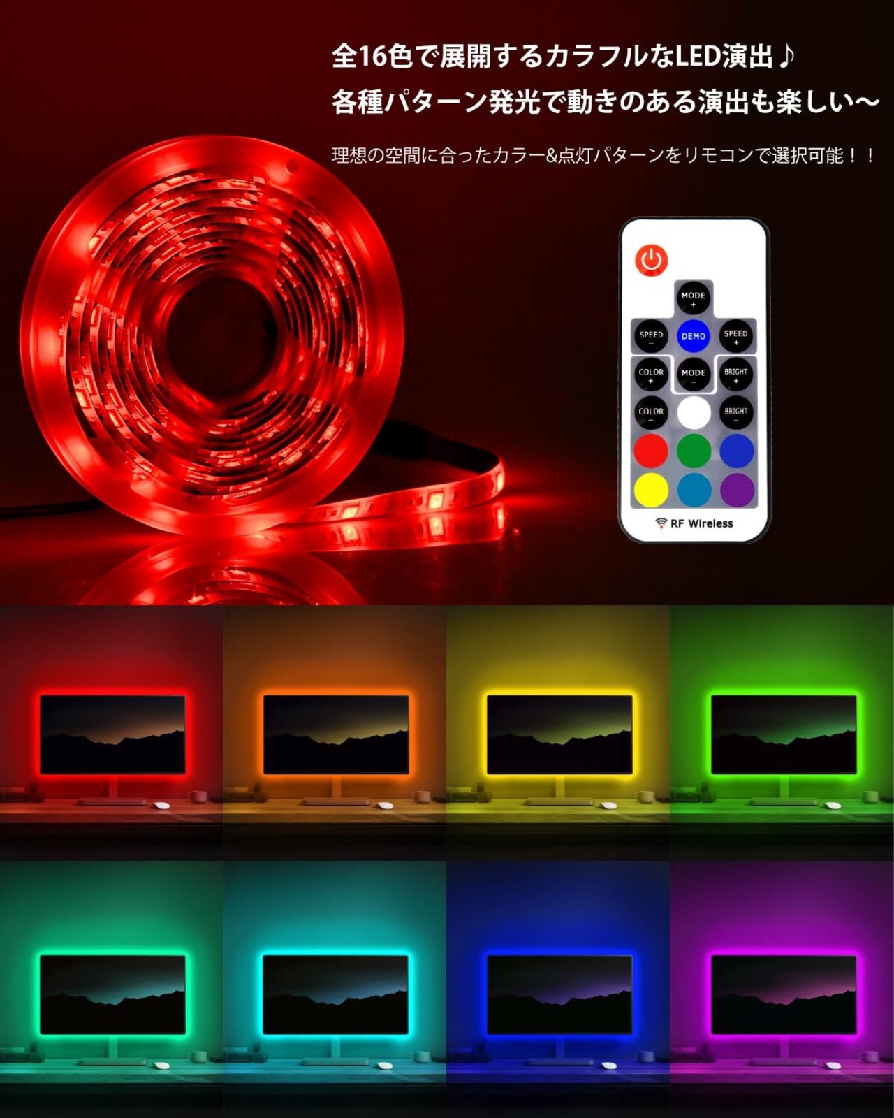 cshare LEDテープライト 防水 USB給電式 LEDテープ 高輝度 調光調色調速 30leds/m 3m テープライト RGB16色 間接照明 SMD 5050 両面テープ 切断可能 キッチン/寝室/テレビ/TV/階段/ベッド/車内/廊下/室内装飾用 ledライトテープ RFリモコン付き LEDストリップライト RGBテープライト