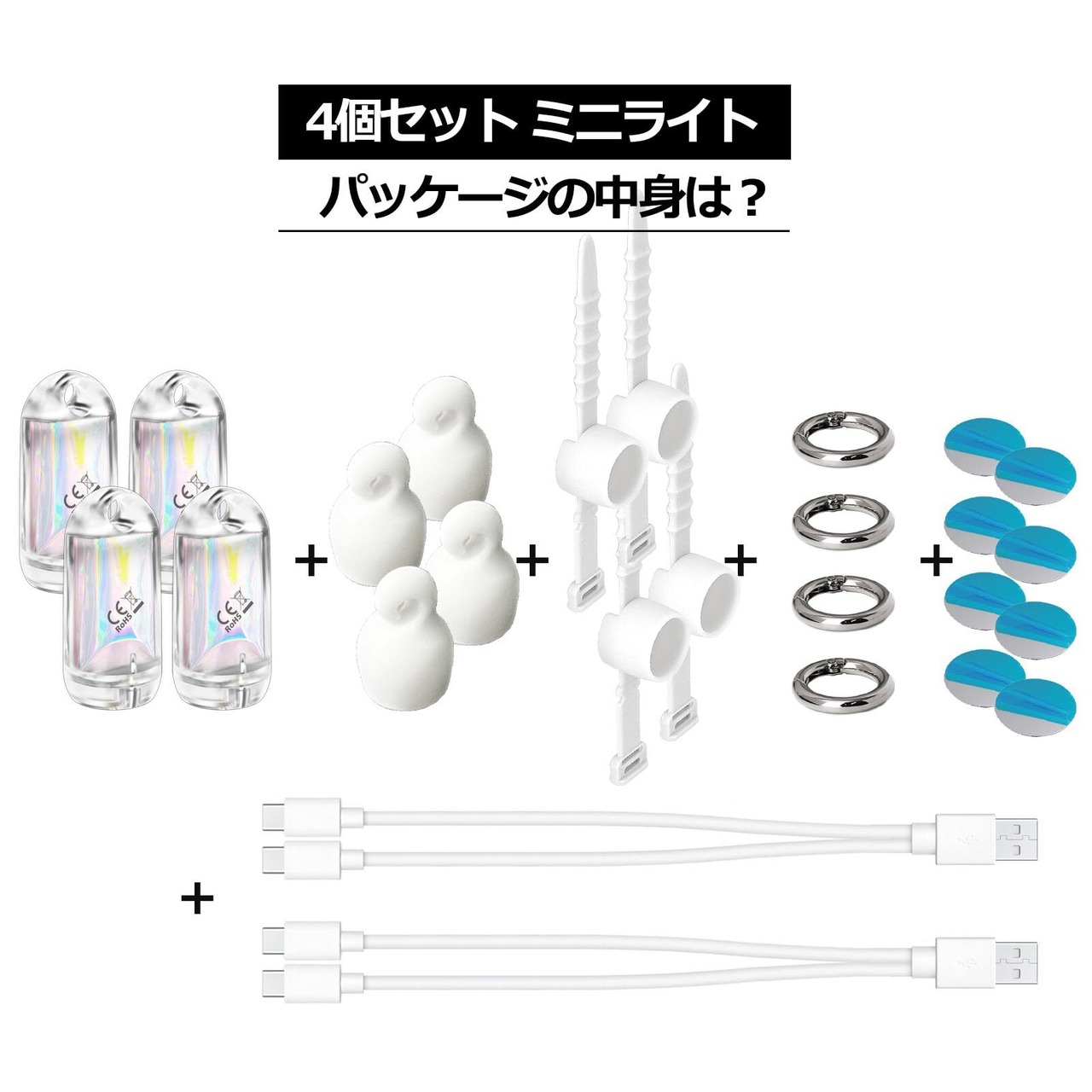 【パッケージリスト】ミニ多機能ライト*4、取扱説明書*1、USB-C充電ケーブル*2(2-in-1)、防水カバー*8(フラットボトム*4+フック*4)、粘着剤付き鉄板*8、キーホルダー*4。