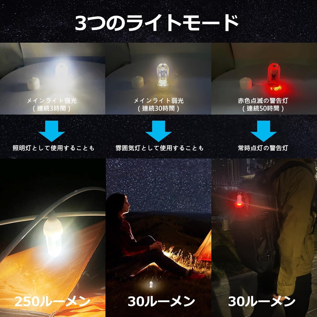 【多彩な機能と用途】①3つのライトモード:赤色の点滅警告灯(30ルーメン/連続50時間)、弱光(30ルーメン/連続30時間)、強光(250ルーメン/連続3時間)。②様々な固定方法が備わっており、フラットな底面で直接使用できるほか、磁気吸着機能により、任意の鉄製の平面に簡単に吸着させることができます。また、キーホルダーやバッグに吊るすこともできるため、非常に持ち運びに適したEDCライトです。③小型 懐中電灯、キャンプ led ミニ ランタン、ポケットライト、投光器、ナイトライト、警告灯、夜間ランニングライト、読書灯、雰囲気照明、ペット用ライトなどに使用でき、非常に実用的です。