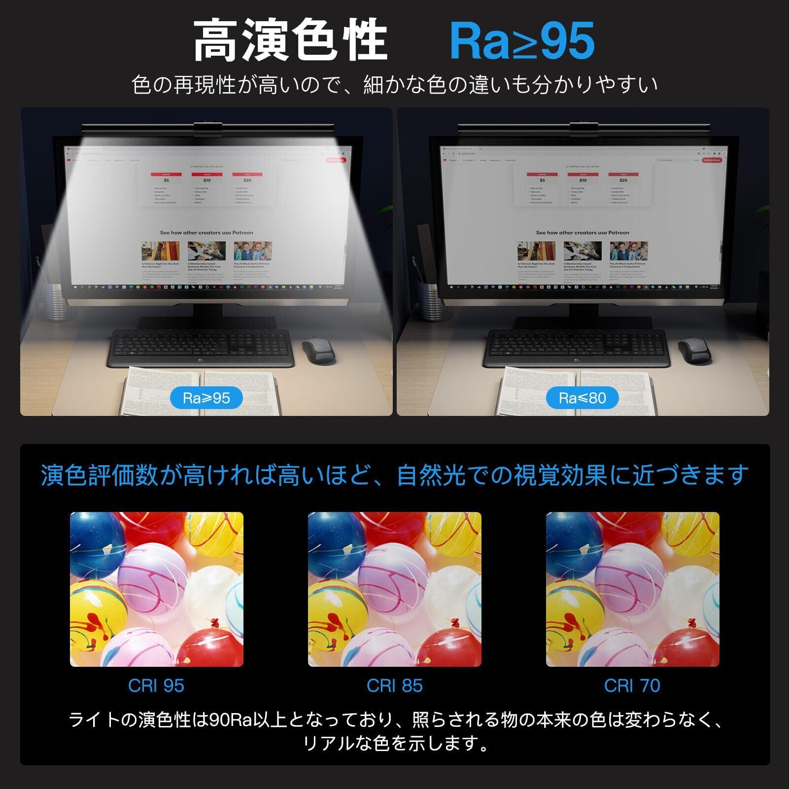 ✦【3色温度無段階調光✚反射光制御】このモニターライトは黄色光、自然光と白色光の3種類色温度が切り替え、3100〜6400Kの色温度の範囲をカバーして、様々なシーンで活用できます。明るさは無段階調整でき、ニーズによって選ばれます。非対称光学設計により、スクリーンからの反射光を制御し、長時間PC作業で目にかかる負担を減らします。その上、 ライトの演色性は90Ra以上となっており、照らされる物の本来の色は変わらなく、リアルな色を示します。光源波動は安定です。