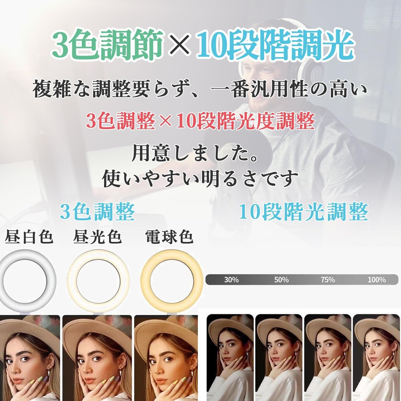 【3色調節×10段階調光のコンパクトなUSBライト】小型ライトながら、複雑な設定は不要。3色×10段階の光度調整が簡単にできるため、初心者でもすぐにプロのようなライティングを実現する女優ライトです。