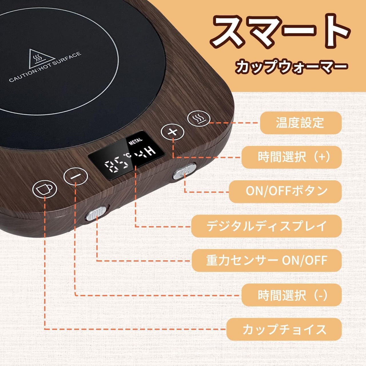 【重力センサー機能 空焚き防止】 マグカップウォーマーには重力感知ボダンがあり、十分な重量を感知しないと運転しません。カップが乗せられないまま10分経過すると加熱機能が止まり、電源が切れる仕組みです。10分以内にカップを戻せば、前の設定したとおりに機能し続けます。カップの重量が300g未満の場合、或いは重力機能が気に入らない方は、重力センサーがオフにしても可能です。