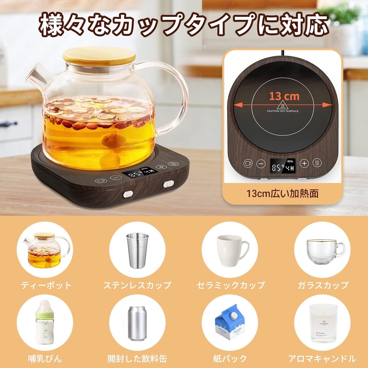 【13cm広い加熱面 ほとんどのカップに対応】 カップ底の直径13 cm以内の耐熱グラス、セラミックカップ、ステンレスカップ、PPSU製哺乳瓶、ティーポット、箱入りミルク、開封した飲料缶、アロマキャンドルなどに対応可能です。保温効果はカップの素材によって異なります。カップの底が平らなタイプを選ぶとより速く温めることが可能です。ふた付きなら、保温性をより高める効果があります。