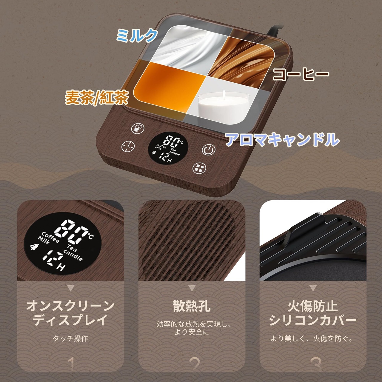 SlowlyTalk カップウォーマー 【より多くの容器サイズに対応・9段温度設定・予約モード】コーヒー保温コースター マグカップウォーマー ドリンクウォーマー コップ保温 コーヒー/お茶/水/牛乳など飲み物 12cm広い加熱面 静音 防水 1-12H自動電源オフ オフィス/家庭用 友達/家族へのプレゼント 加熱コースター(01木目)