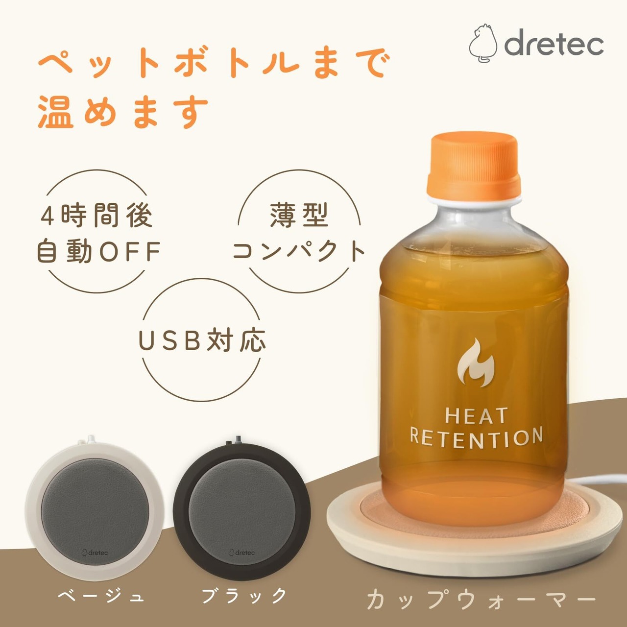 ドリテック(dretec) カップウォーマー ペットボトルOK マグカップOK 保温コースター 自動OFF USB コンパクト 小型 薄型 軽量 オフィス テレワーク ベッドサイド コーヒー 温め ホットコースター おしゃれ ベージュ
