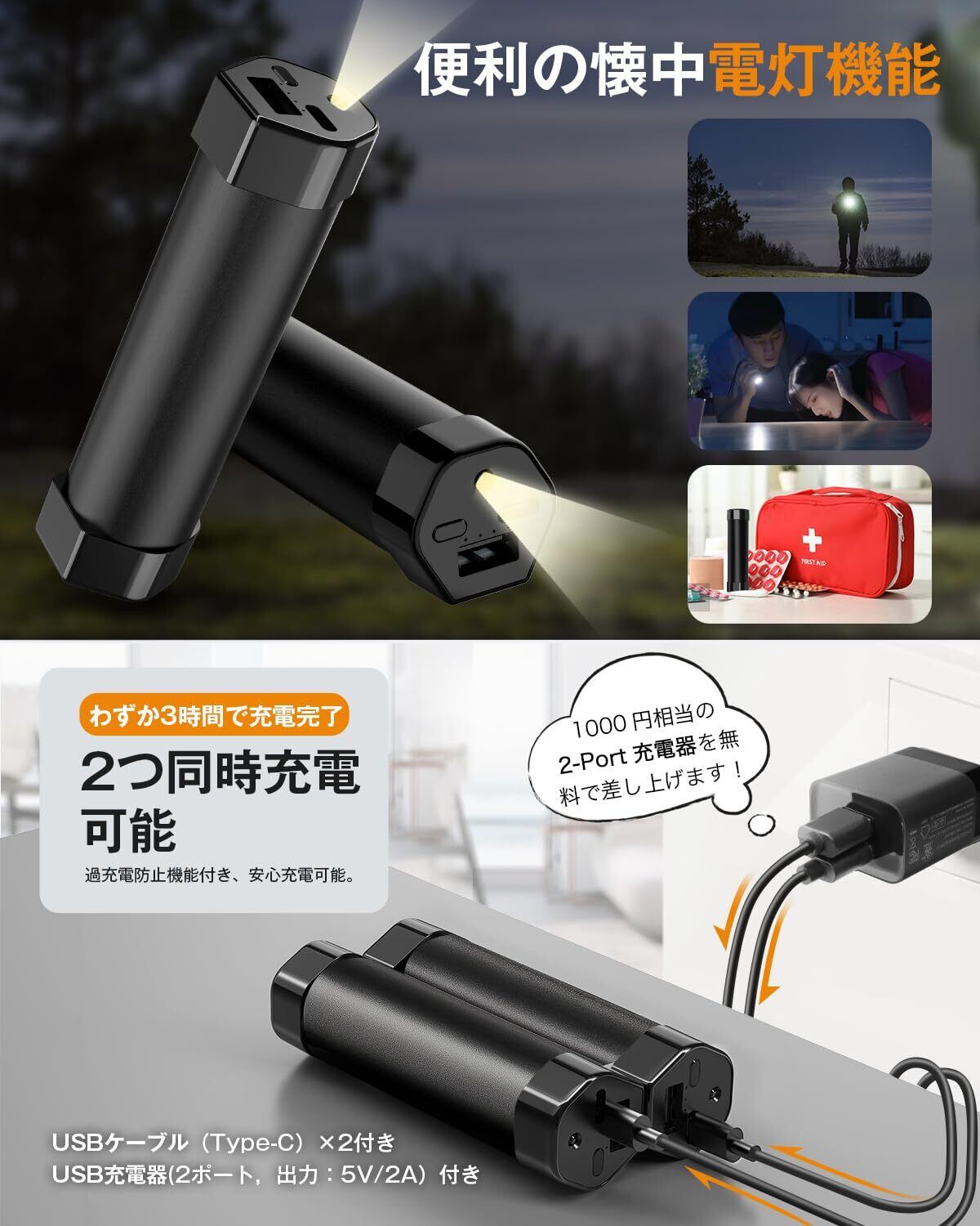 付属コンポーネント USBケーブル(Type-C)*2, USB充電器(2ポート、出力:5V2A), ユーザーマニュアル, 充電式カイロ*2, 収納ポーチ