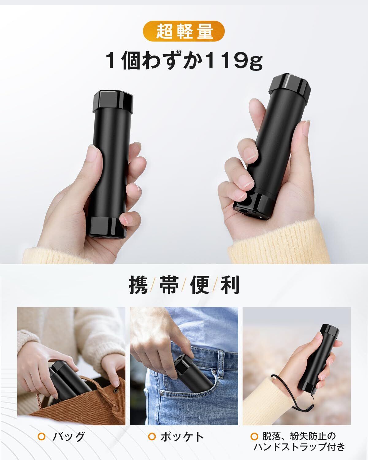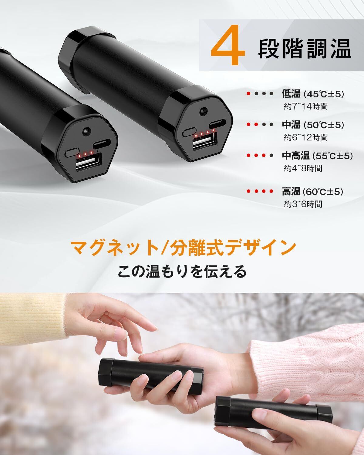 【4段階調節・最高65℃加熱・360°全方向加熱・3秒速熱】4段階に温かさを調整できますので、使用する環境に合わせて温度の設定が可能。①低温(約45℃±5)②中温(約50℃±5)③中高温(約55℃±5)④高温(約60℃±5)。握りやすい棒状で360全方向加熱、握り心地も良い。また、電源を入れて約3秒で温まる速暖性も大きな魅力。