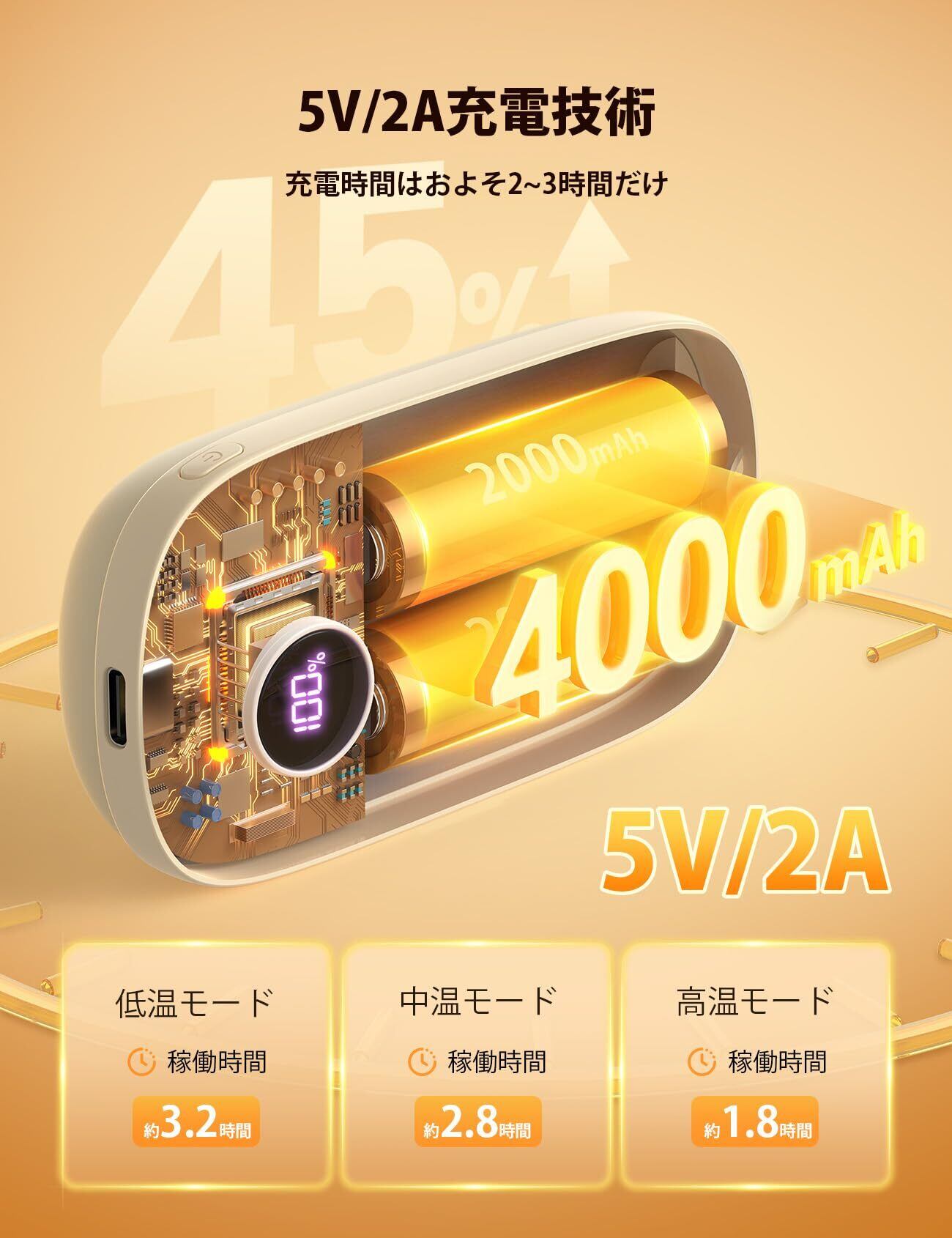 【3階段温度調整・操作簡単・ディスプレイ表示】3段階の温度(低温45℃、中温50℃、高温55℃)設定があります。モード切り替えボタンを短押しして、環境温度によって適切な温度を調節できます。不要な時は長押しすると電源が切れるのもとても便利です。搭載されたLEDデジタルスクリーンに残り電量と温度を表示します。温度状態が一目瞭然だけではなく、いつでも電気残量を知ることもでき、必要に応じて充電できます。