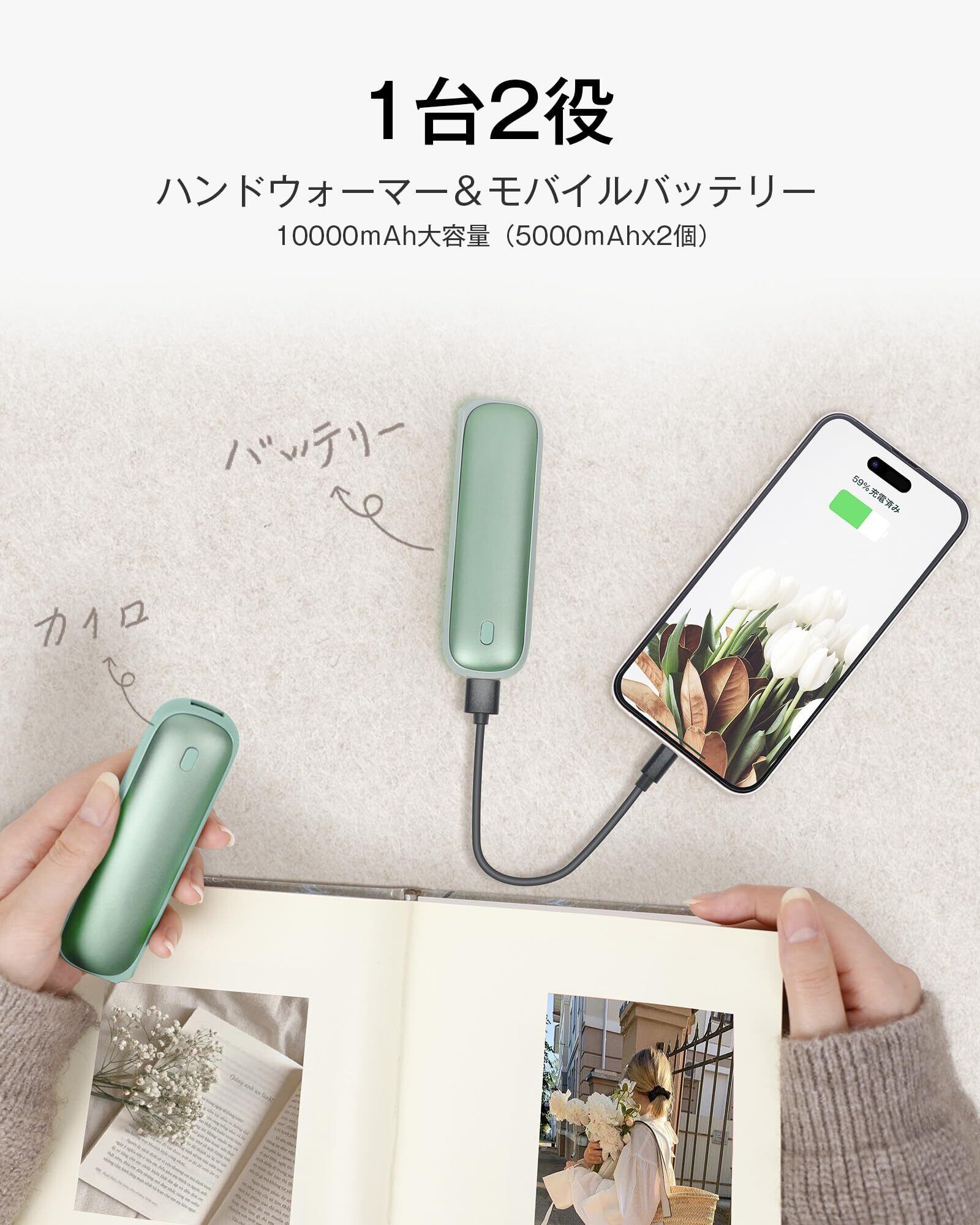 【1台2役・モバイルバッテリー機能搭載】ハンドウォーマーとしてだけでなく、10000mAhの大容量バッテリーを搭載したモバイルバッテリーとしても利用できます。スマートフォンやワイヤレスイヤホンなど、2つのデバイスを同時に充電することができ、特に寒い環境で長時間外出する際に便利です。また、移動中にバッテリーが切れてしまう心配もなく、いつでも手元に電力を確保できるので、外出時の安心感が違います。