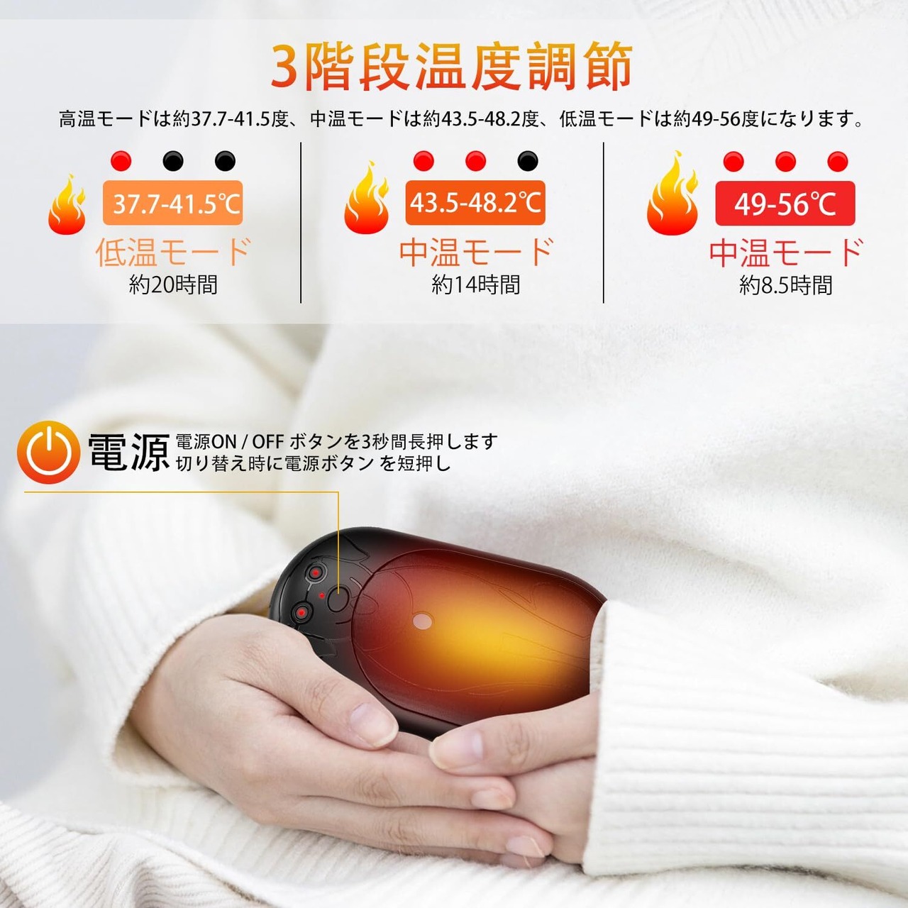 3温度調節機能:COTOP充電式カイロはわずか3秒で電源を入れることができます。発熱が早い。寒い朝の通勤・通学に心強いアイテムです。最後は低温モードで約20時間。低温モード:40℃・約20時間、中温モード:50℃・約14時間、高温モード:60℃・約8.5時間。高齢者は熱に鈍い場合もあるので、低温やけどの心配はありません。低温モード推奨。寒さに合わせて簡単に温度調節ができ、寒い冬でも手足を暖かく保ちます。また、スイッチを3秒ほど長押しすると電源が入り、切り替える際は電源ボタンを短押しします。使いやすい。ハンドヘルドカイロの充電時間は、0からフル充電まで約4〜5時間です。