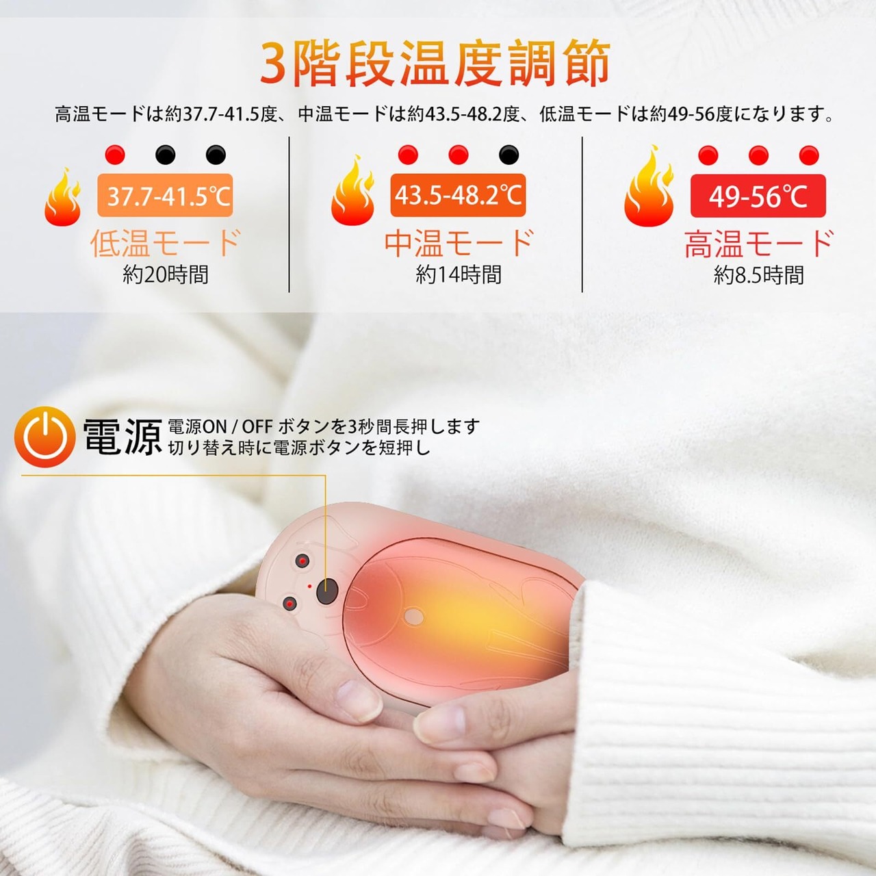 3温度調節機能:COTOP充電式カイロはわずか3秒で電源を入れることができます。発熱が早い。寒い朝の通勤・通学に心強いアイテムです。最後は低温モードで約20時間。低温モード:40℃・約20時間、中温モード:50℃・約14時間、高温モード:60℃・約8.5時間。高齢者は熱に鈍い場合もあるので、低温やけどの心配はありません。低温モード推奨。寒さに合わせて簡単に温度調節ができ、寒い冬でも手足を暖かく保ちます。また、スイッチを3秒ほど長押しすると電源が入り、切り替える際は電源ボタンを短押しします。使いやすい。ハンドヘルドカイロの充電時間は、0からフル充電まで約4〜5時間です。