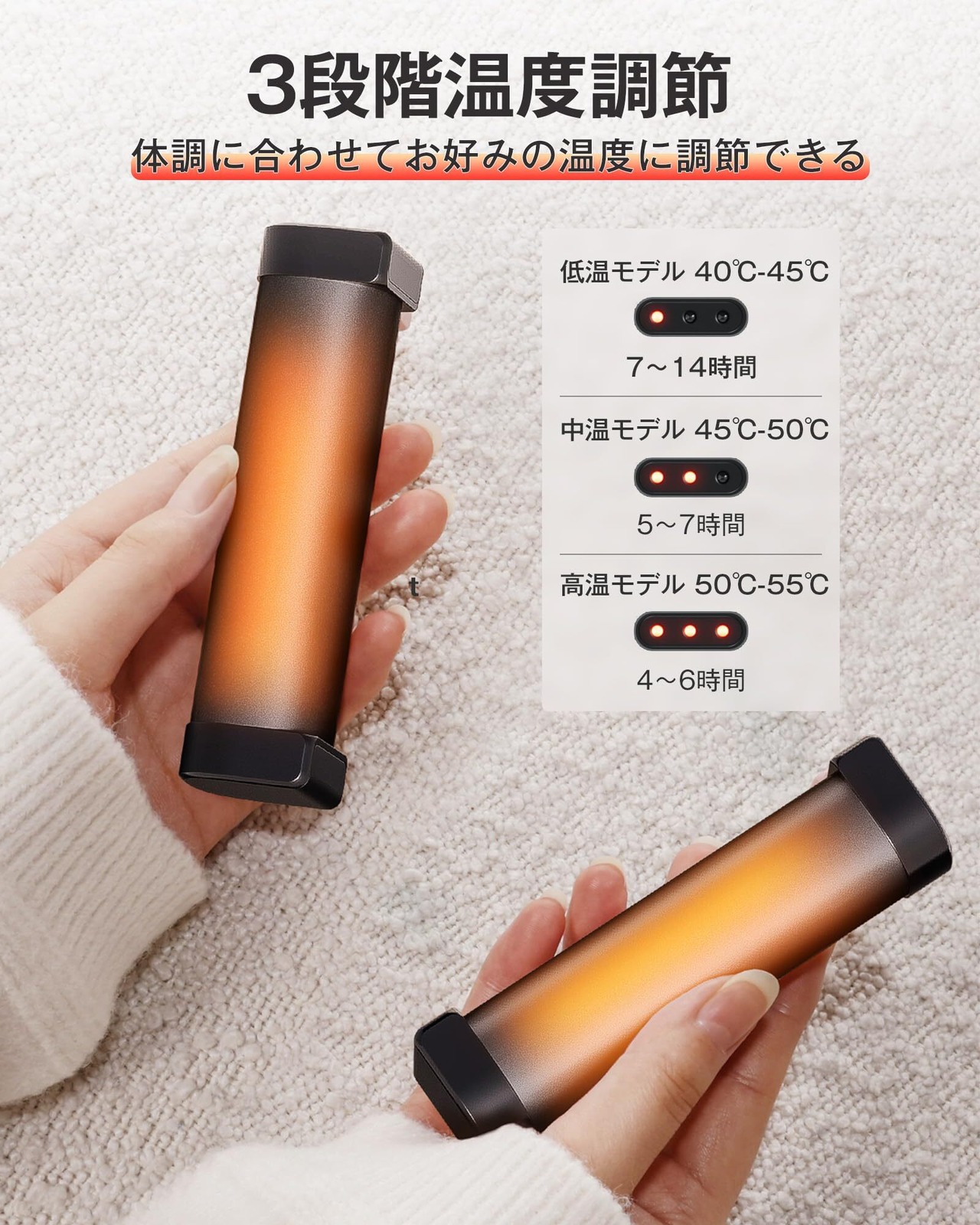 【3階段温度調節】この「充電式カイロ モバイルバッテリー」は、寒い季節に欠かせない便利アイテムです。3段階の温度調節機能が備わっており、低温モード(40〜45℃)、中温モード(45〜50℃)、高温モード(50〜55℃)、周囲の気温やお好みに合わせて簡単に調節できます。さらに、電源ボタンは3秒間長押しすることでしか作動しないため、誤って電源が入ってしまう心配もありません。寒冷地にお住まいの方や、外でのお仕事、アウトドア、スポーツ観戦など、寒さが気になるシーンで大活躍します。