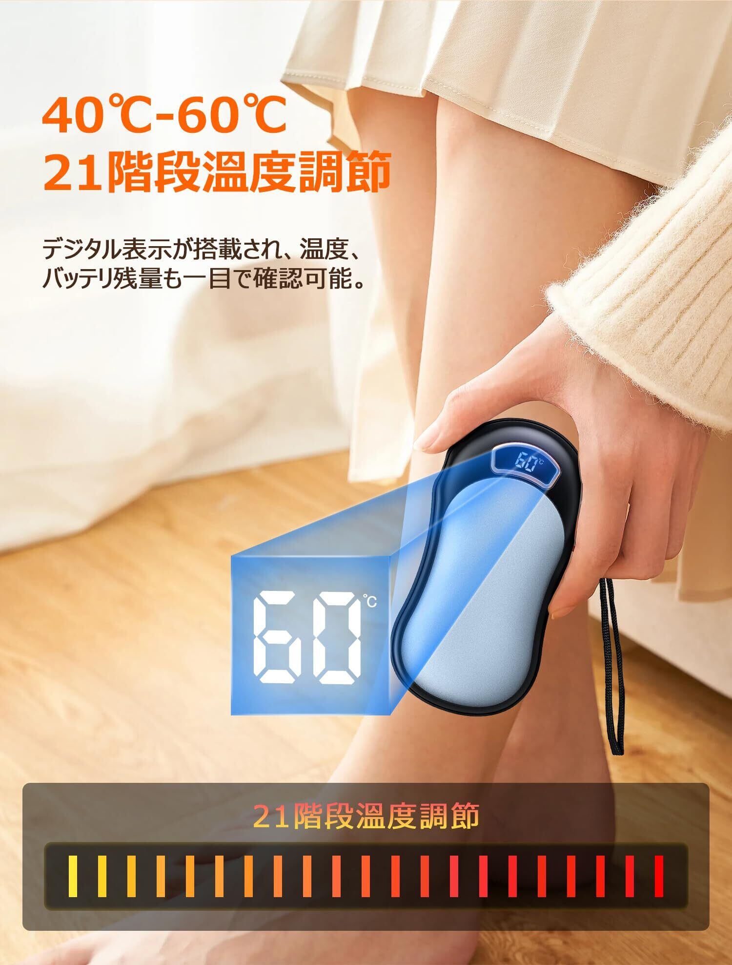 【21段階温度調節】電気カイロはLEDデジタル表示部を搭載し、バッテリー残量と温度確認が一目瞭然。携帯カイロは、3段階調節のカイロと違い、21段階(40-60℃)温度調節が可能で、自由にお好みの温度に調節することができます。温度を60℃に調節すると保温効果が更にアップ!
