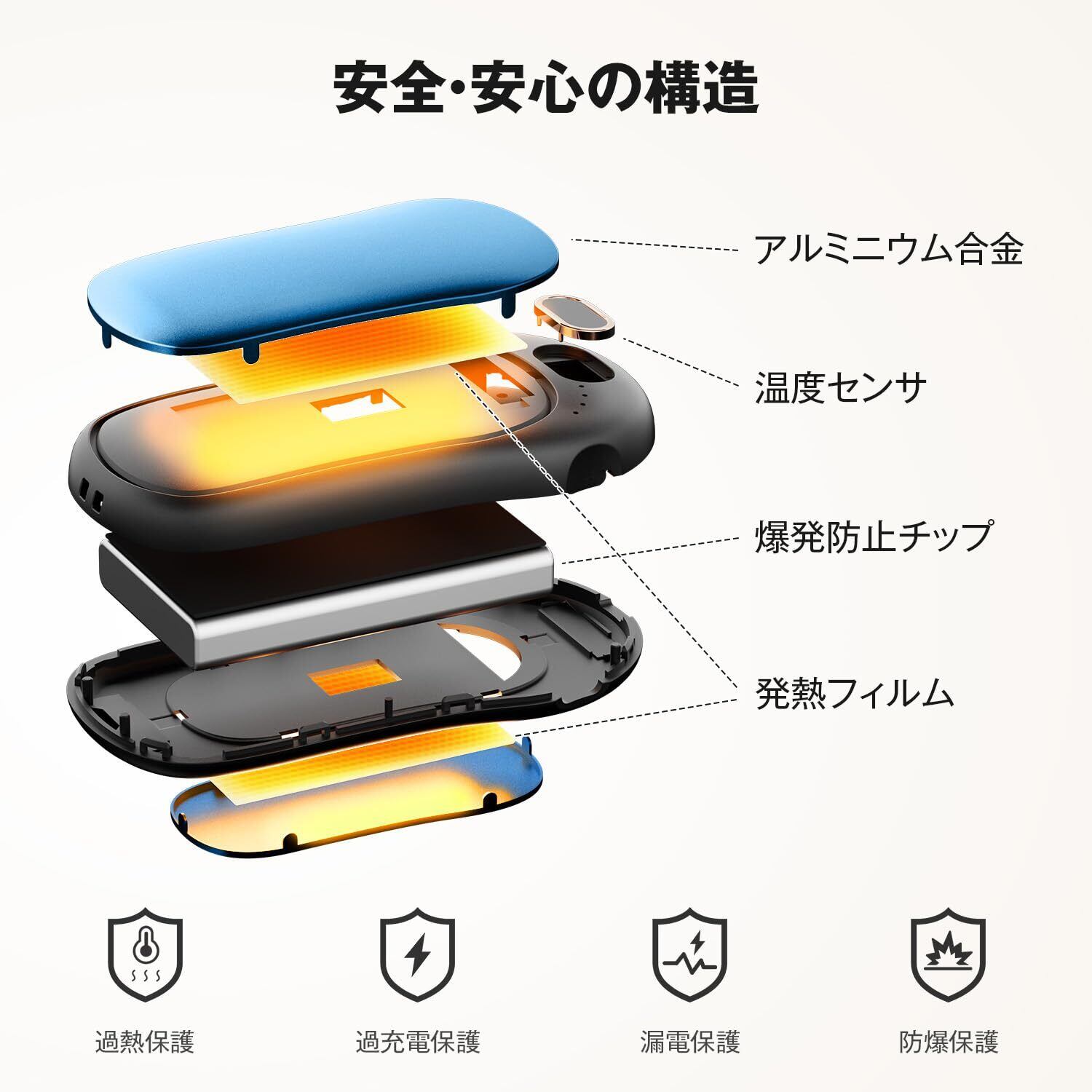 【12000mAh大容量・PSE認証】分離式カイロは12000mAh大容量バッテリーを搭載し、急速充電に対応しています。日本の電気用品安全法(PSE)の技術基準に合格したハンドウォーマーで、過充電・過放電・過電圧・過熱などの複数の保護機能が搭載し、安心・安全にご使用いただけます。