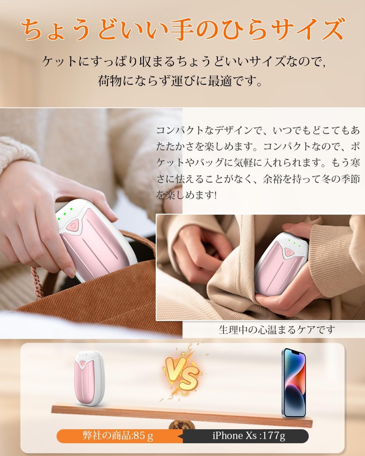 【超軽量・携帯便利】1個の重量はわずか85gで、女性やお子様もストレスなく握りやすく、収納・持ち運びやすいです。カイロの表面はこだわり工芸で優しい肌触りです。ポケットに入れると、通勤、通学、オフィス、スポーツ、アウトドア、外出の際にご利用いただき、暖かさをいつでも楽しめます。