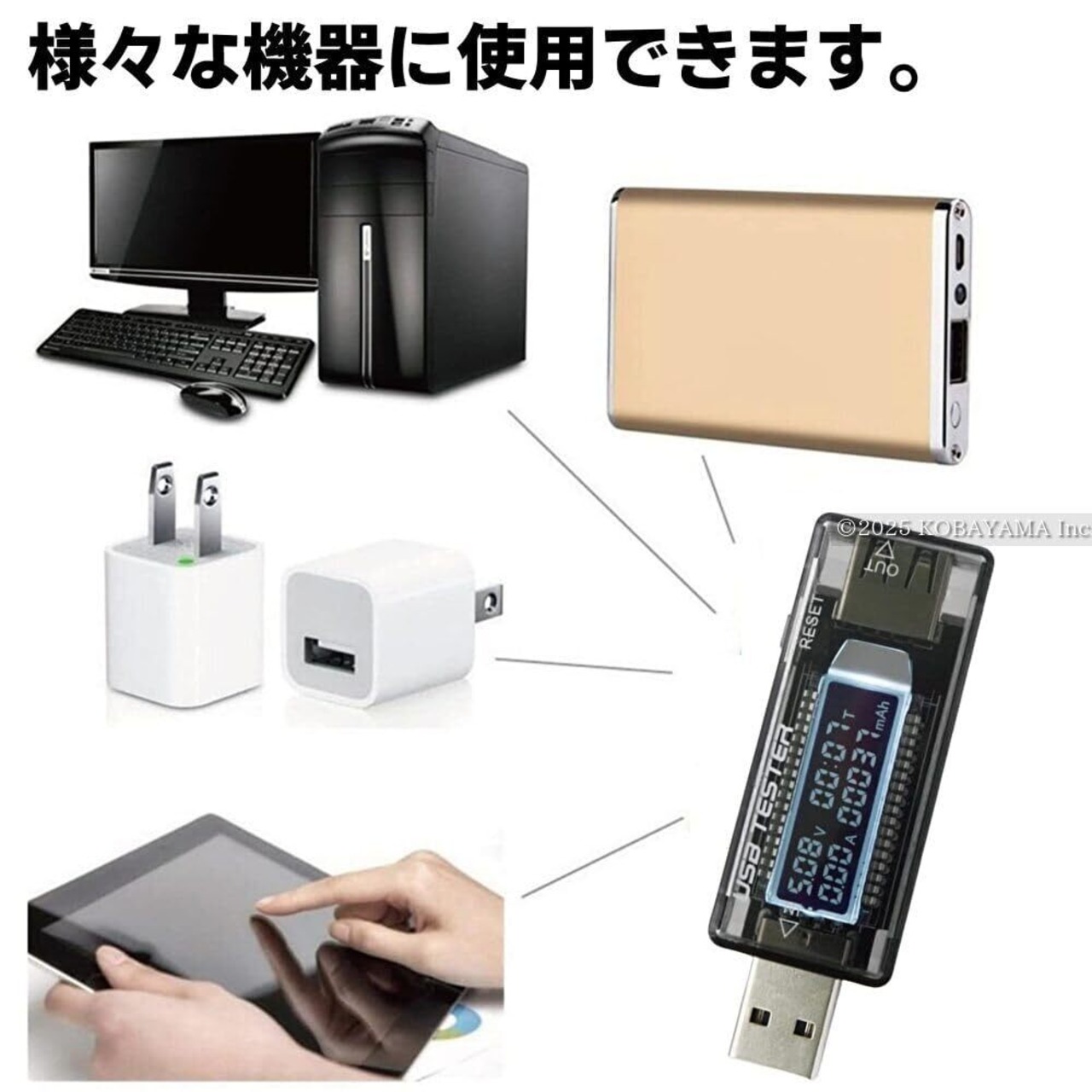 電圧と電流状況を計測して、バイルバッテリー 、iPhoneや各社Androidスマホなどを保護します。追加の電源不要 です。
