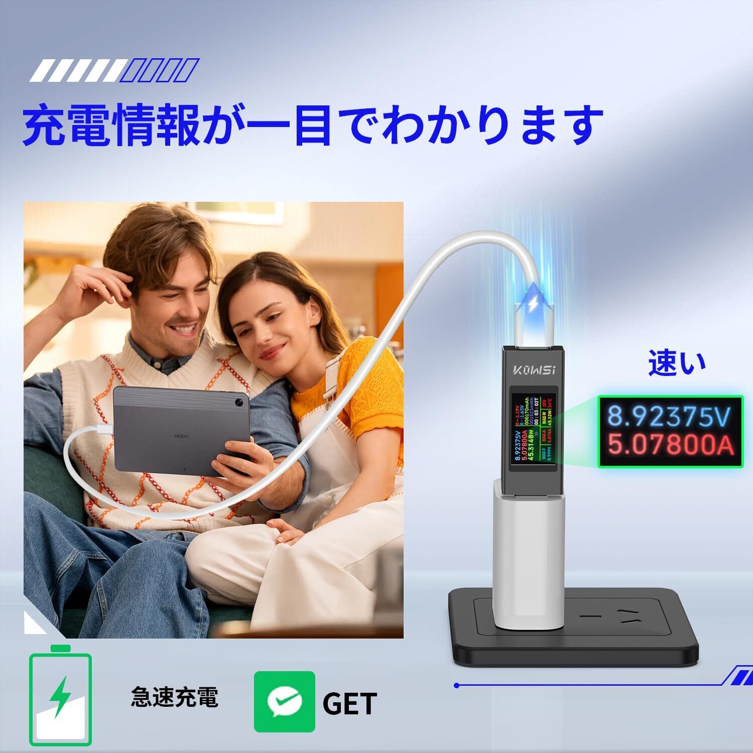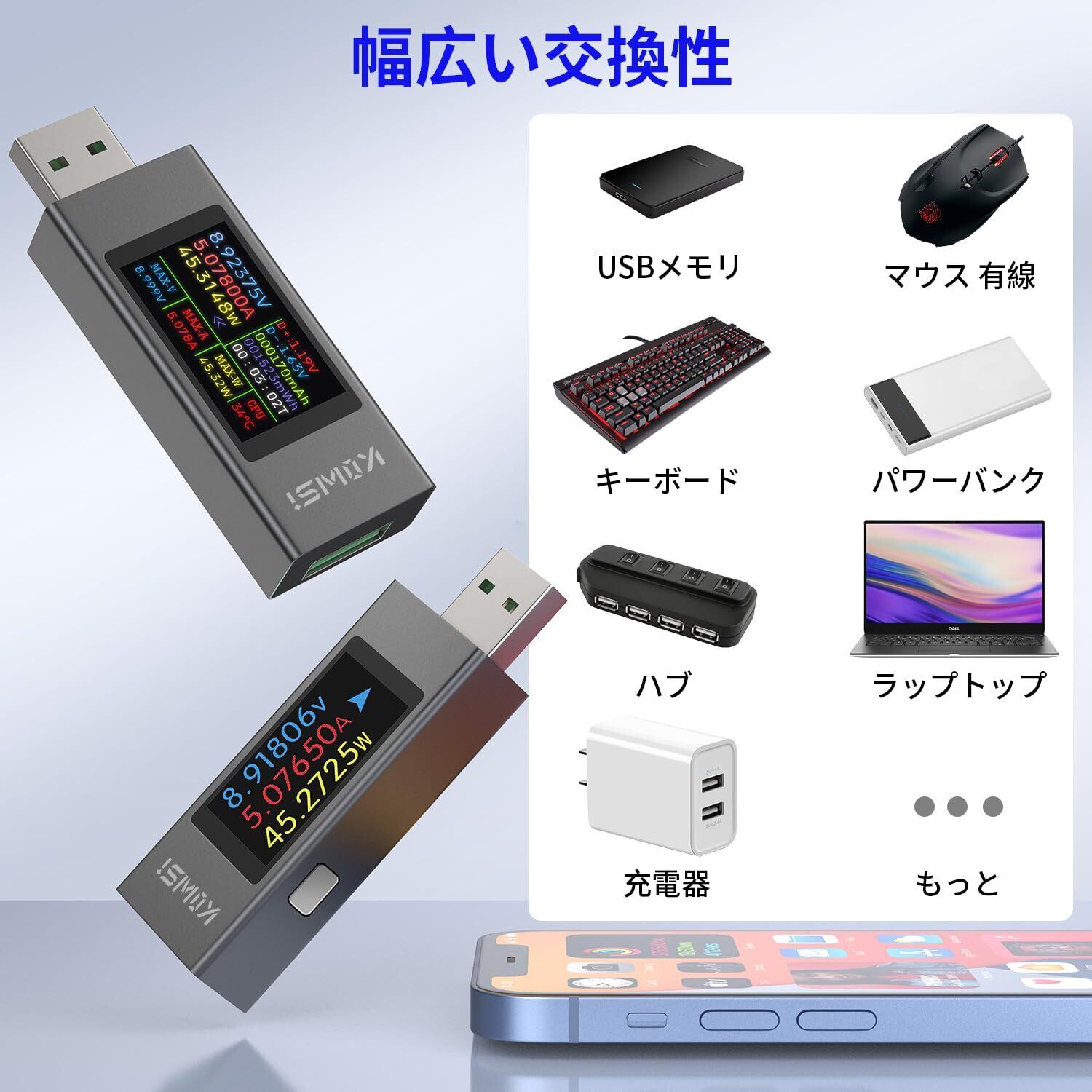 幅広い交換性:このUSBマルチメーターはタブレット、充電器、モバイルバッテリー、ケーブルなどのUSB-Aデバイスを対応でき、デバイスが老朽化していないか、急速充電が可能かどうかを確認します。電子製品に合った充電機器をお選びいただけます