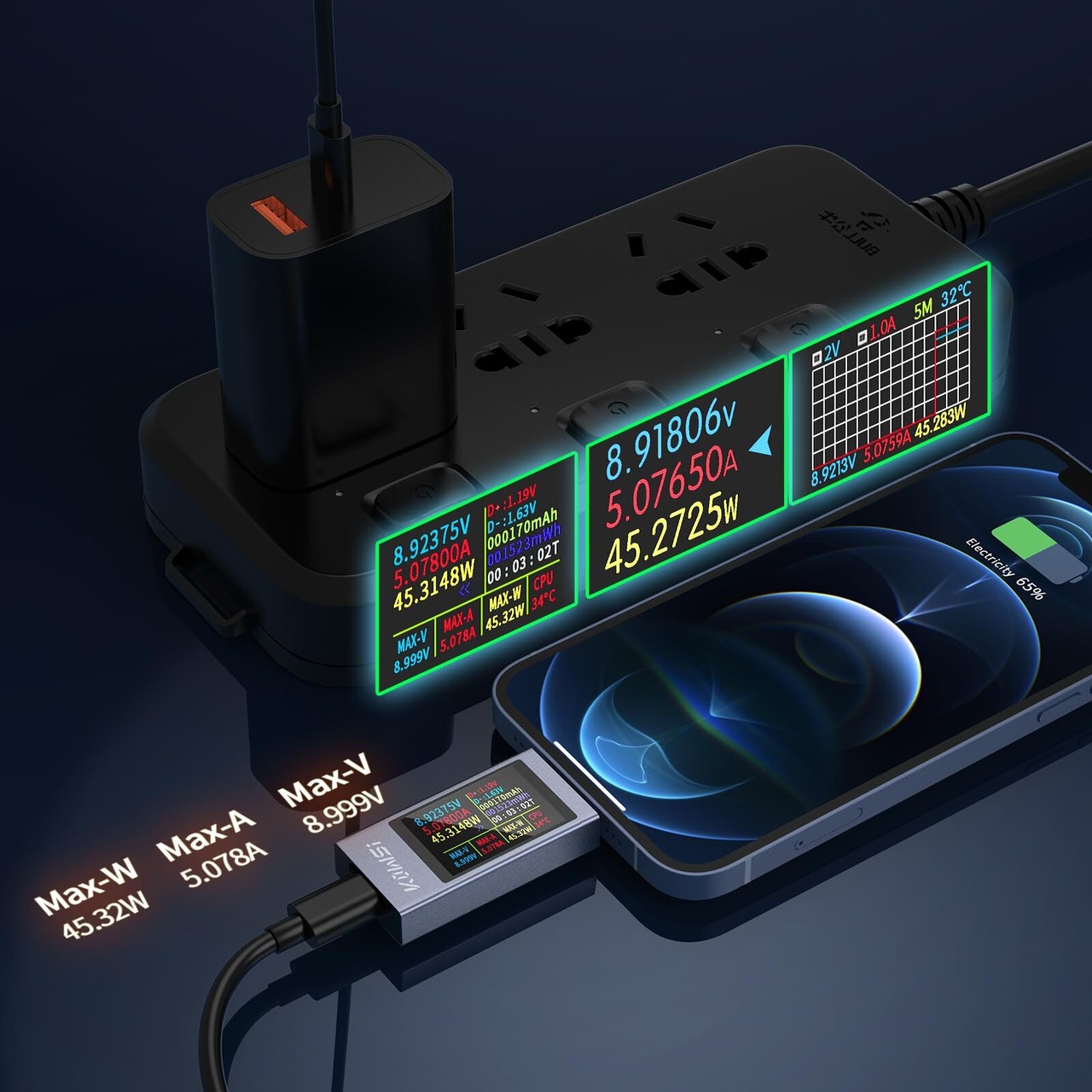 USBCテスター: このUSB テスターは、デバイスを充電中の最大電力、電流、電圧を記録し、電圧、電流、容量、電気量、電力、温度、充電時間を検出できるため、電源と品質のテストが容易になります。