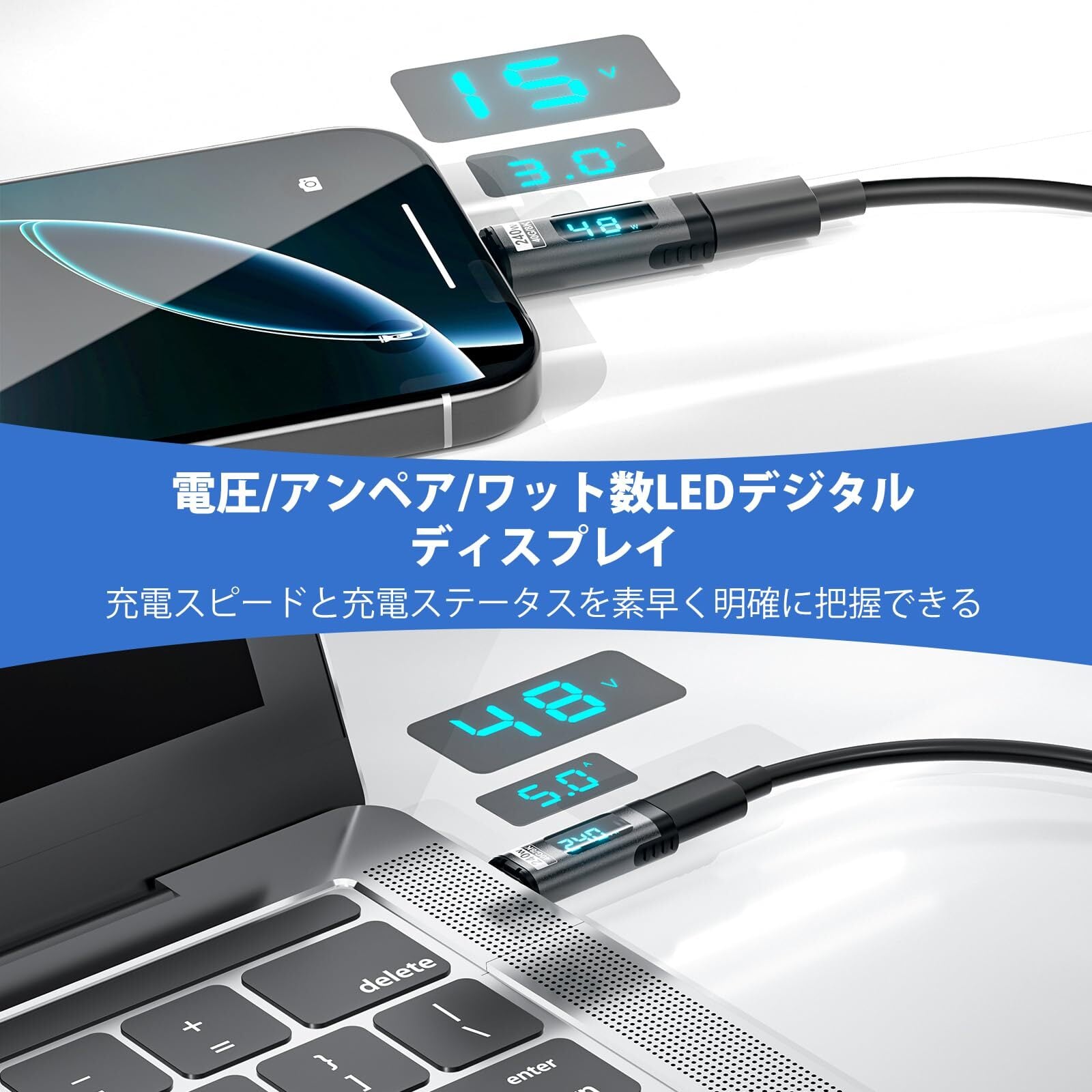 デジタルLEDディスプレイの新しい設計:このUSB C磁気アダプターは、正確な電圧、アンペア数、ワット数の測定を提供し、充電の問題を特定し、充電パフォーマンスに関する洞察を提供します。 明るいディスプレイは読みやすく、電圧、アンペア数、ワット数の読み取り値を自動的に切り替えます。
