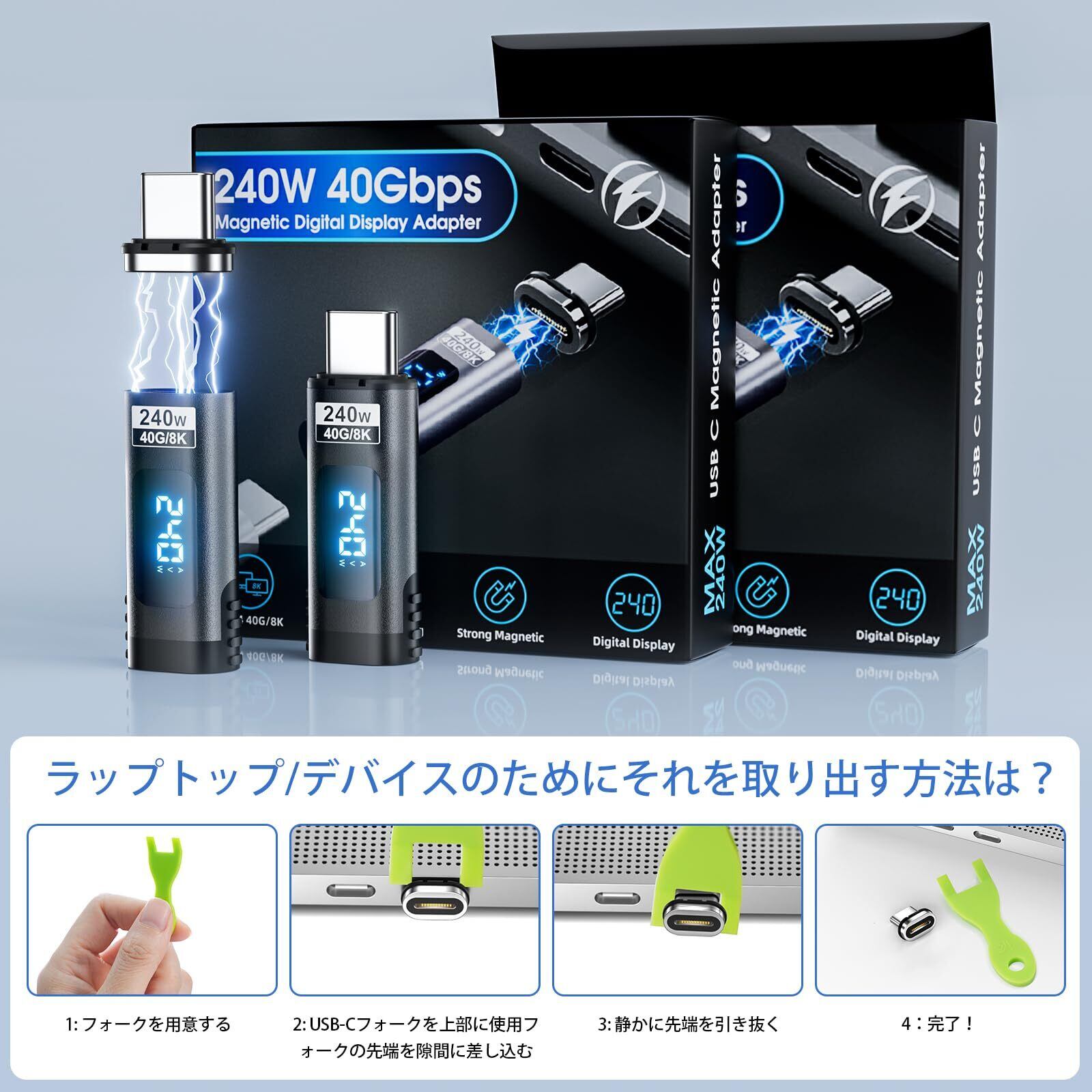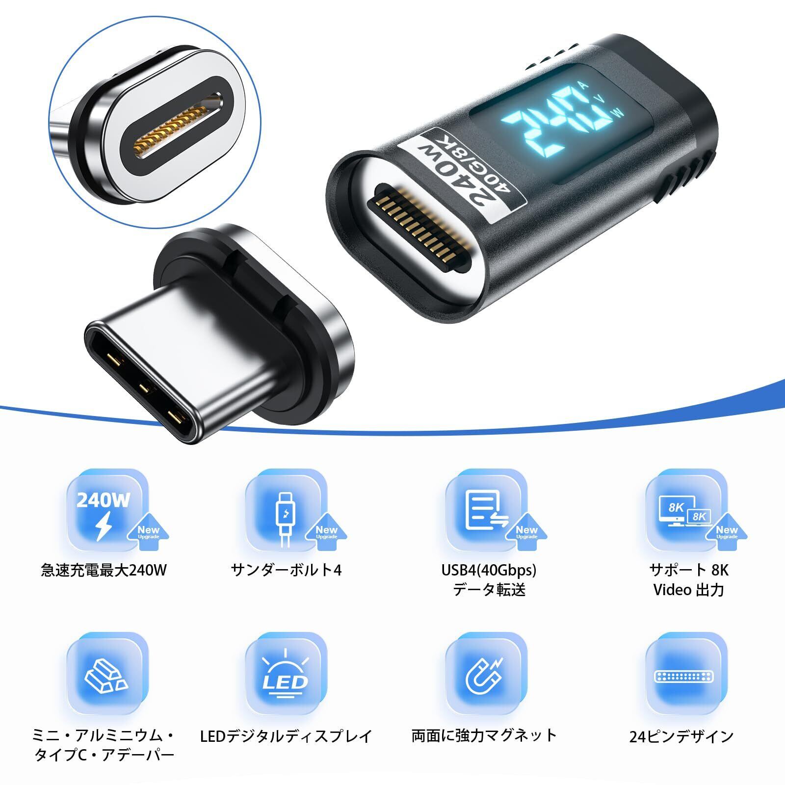 DuHeSin デジタルディスプレイ USB C 磁気アダプター PD 240W 24ピン (2パック) 電圧電流電源 LEDディスプレイ付き Type C パワーメーター テスター ストレート USB4 40Gbps 8K 60Hz Thunderbolt 3/4 MacBook Pro/Air用