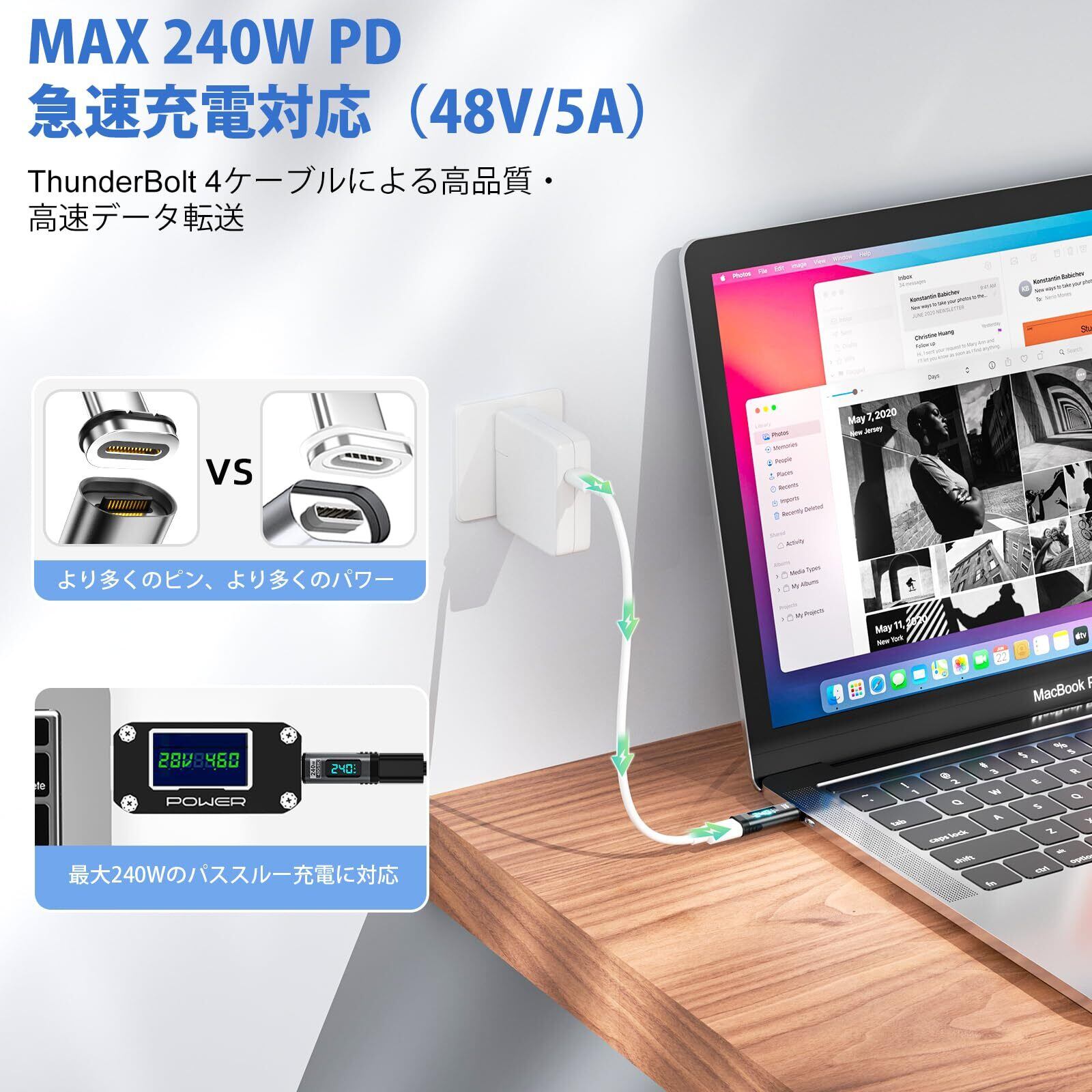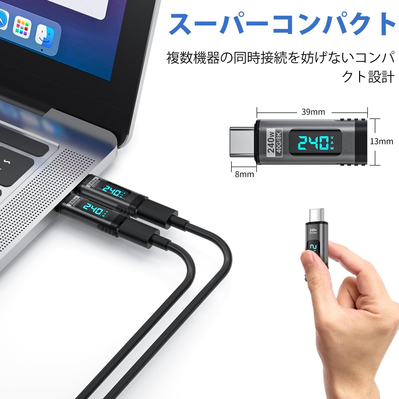 240W PD高速充電&40Gbpsデータ転送:この磁気USB Cパワーメーターテスターアダプターは、最大240Wで動作し、Macbookやその他のUSB-Cデバイスの要件を満たす電力量を完全に提供します。 デバイスのニーズに応じて、電源出力パラメータを自動的に調整できます。 データ転送速度は最大40Gbpsです。