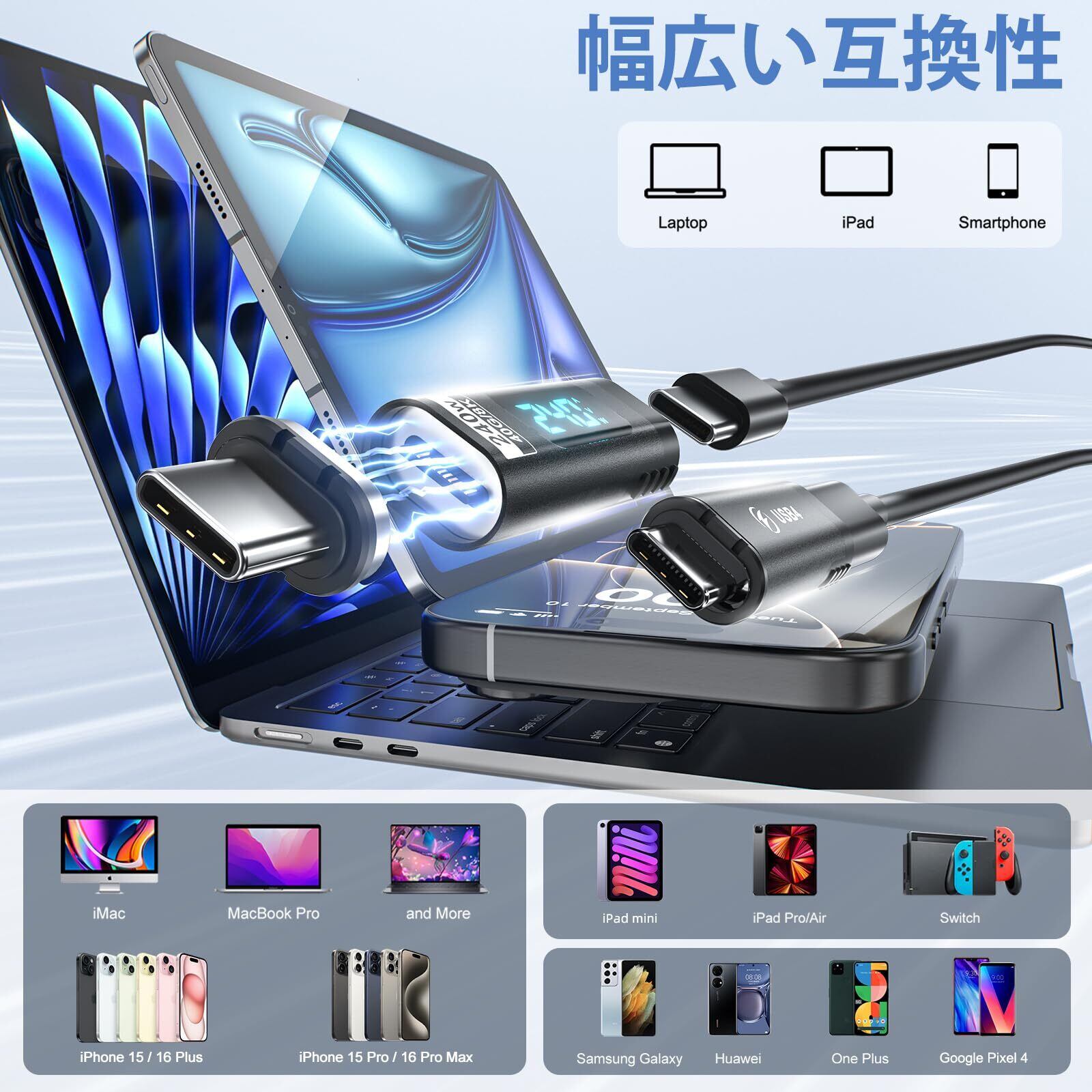 幅広い互換性:Type C磁気アダプターは、iPhone 16/15シリーズ、MacBook Pro Mac Air、Chromebook、Dell XPS、Lenovo ThinkPad、Switch、Steam Deck、ROG Ally、iPadシリーズ、Samsung Galaxy Book、その他のタイプCポートデバイスを備えたノートパソコン、タブレット、スマートフォンと互換性があります。