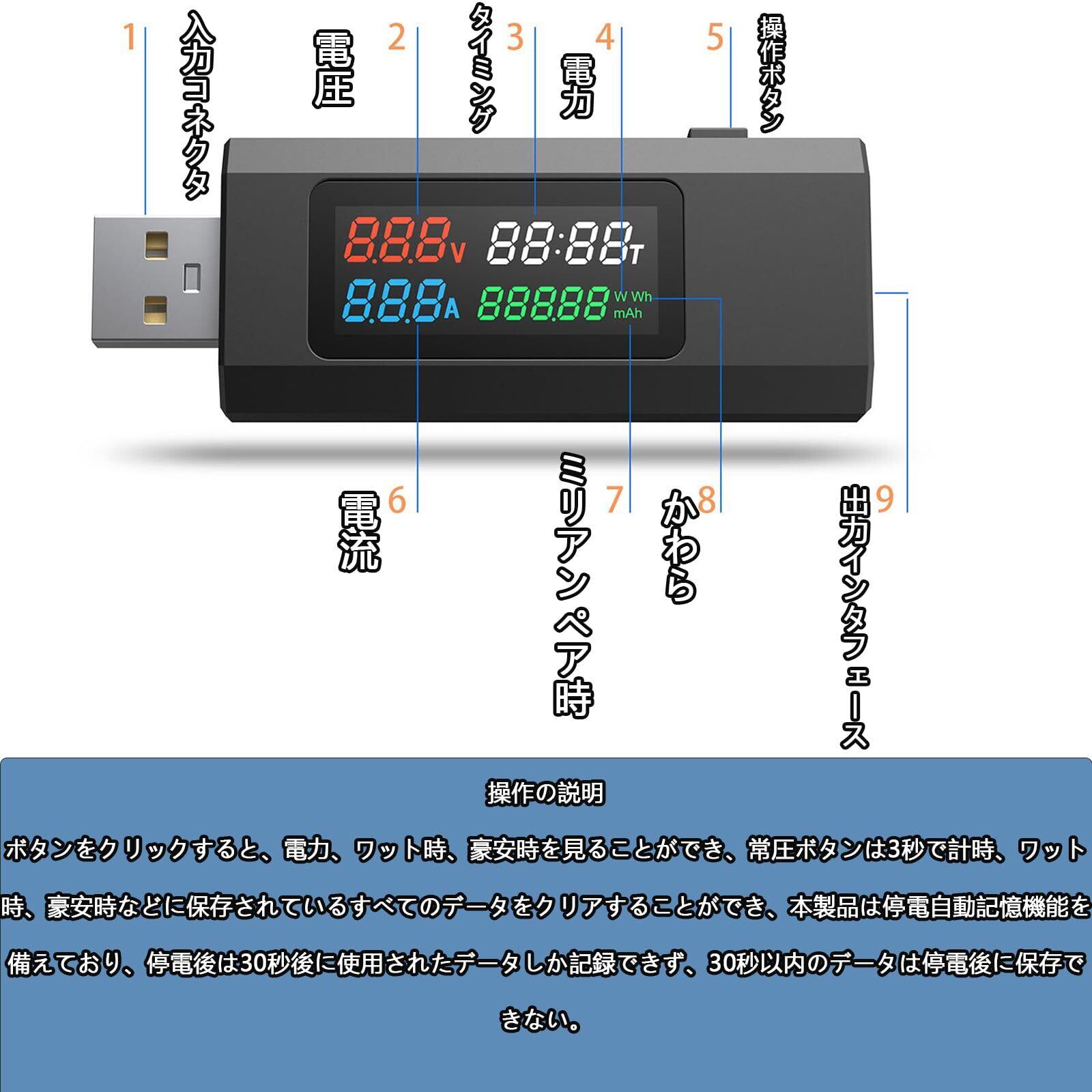 【カラー液晶画面】このUSB電流電圧テスターはカラー液晶画面で、すべての充電情報が画面にはっきりとはっきりと表示され、便利で実用的です。スマートなデザイン カラースクリーンと直感的なボタン操作で、データが一目で確認できます。注意:入力ポートを充電器またはモバイル電源に差し込み、USBテストツールの電圧を観察します。もし出力電圧が電子製品の許容充電電圧範囲を超える場合は、この充電器またはモバイル電源の使用を中止してください。