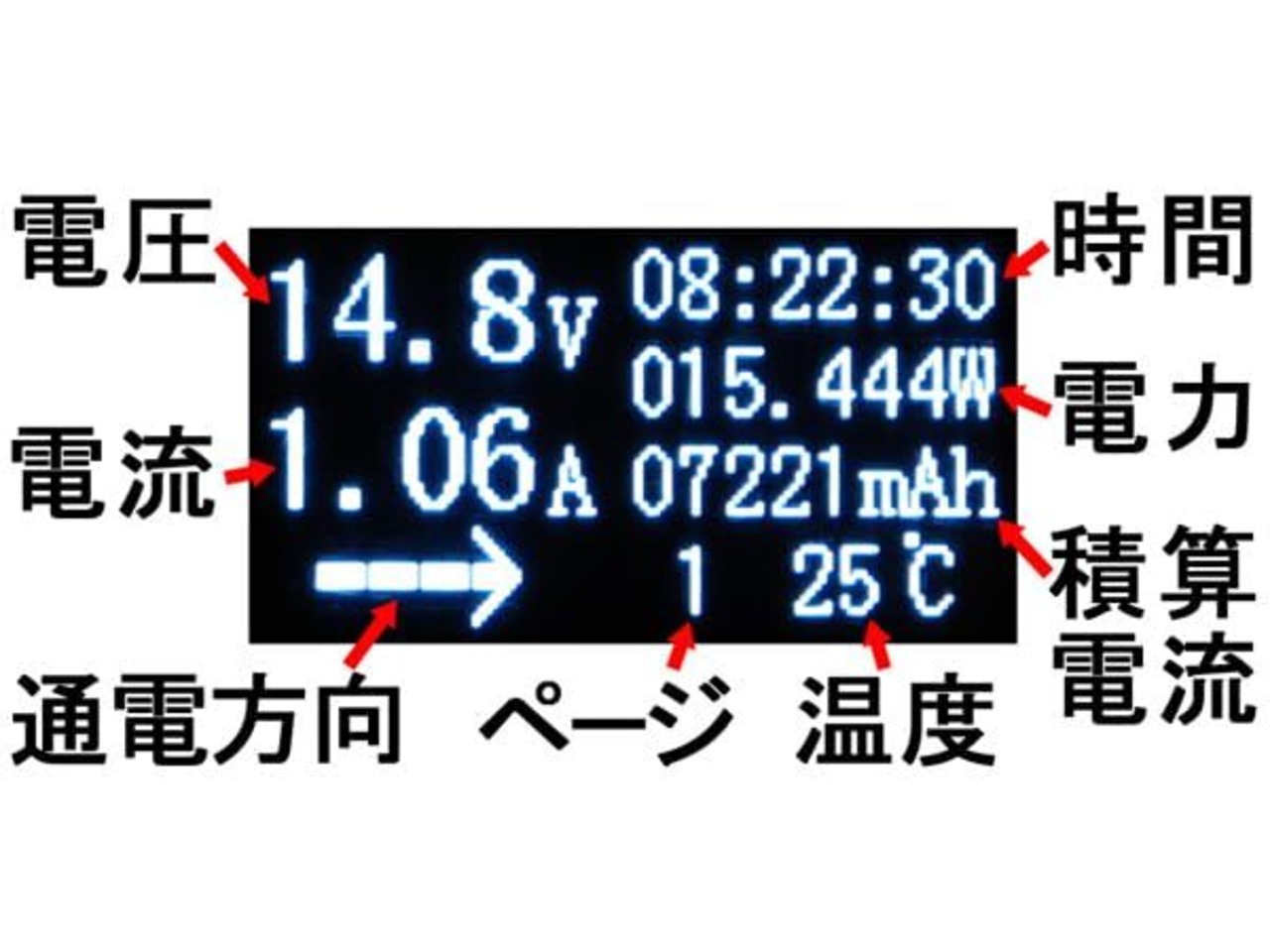 測定機能 : 電圧 4V~30V 、 電流 50mA~8A 通電方向、時間、電力、積算電流、他