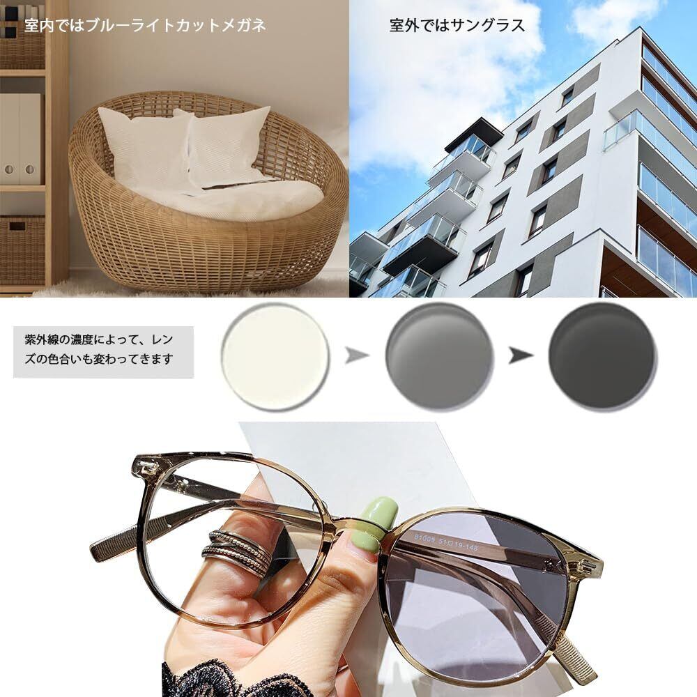 変色調光機能:レンズが紫外線に反応して色が変わり、屋外ではサングラスのように暗くなり、屋内ではクリアになります。曇り、晴れのような天気に気軽に対応することができます
