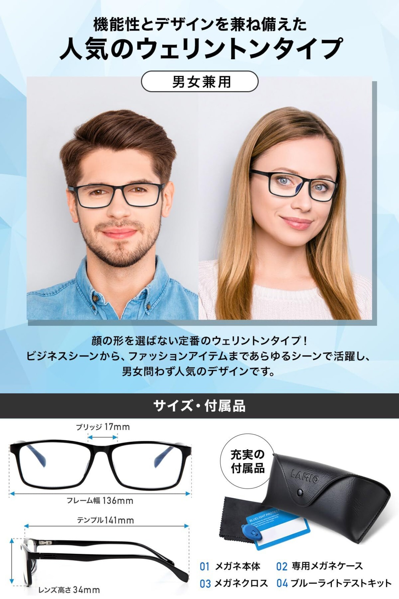 【充実の付属品】PC用メガネ本体・メガネケース・メガネクロス・ブルーライトテストキット