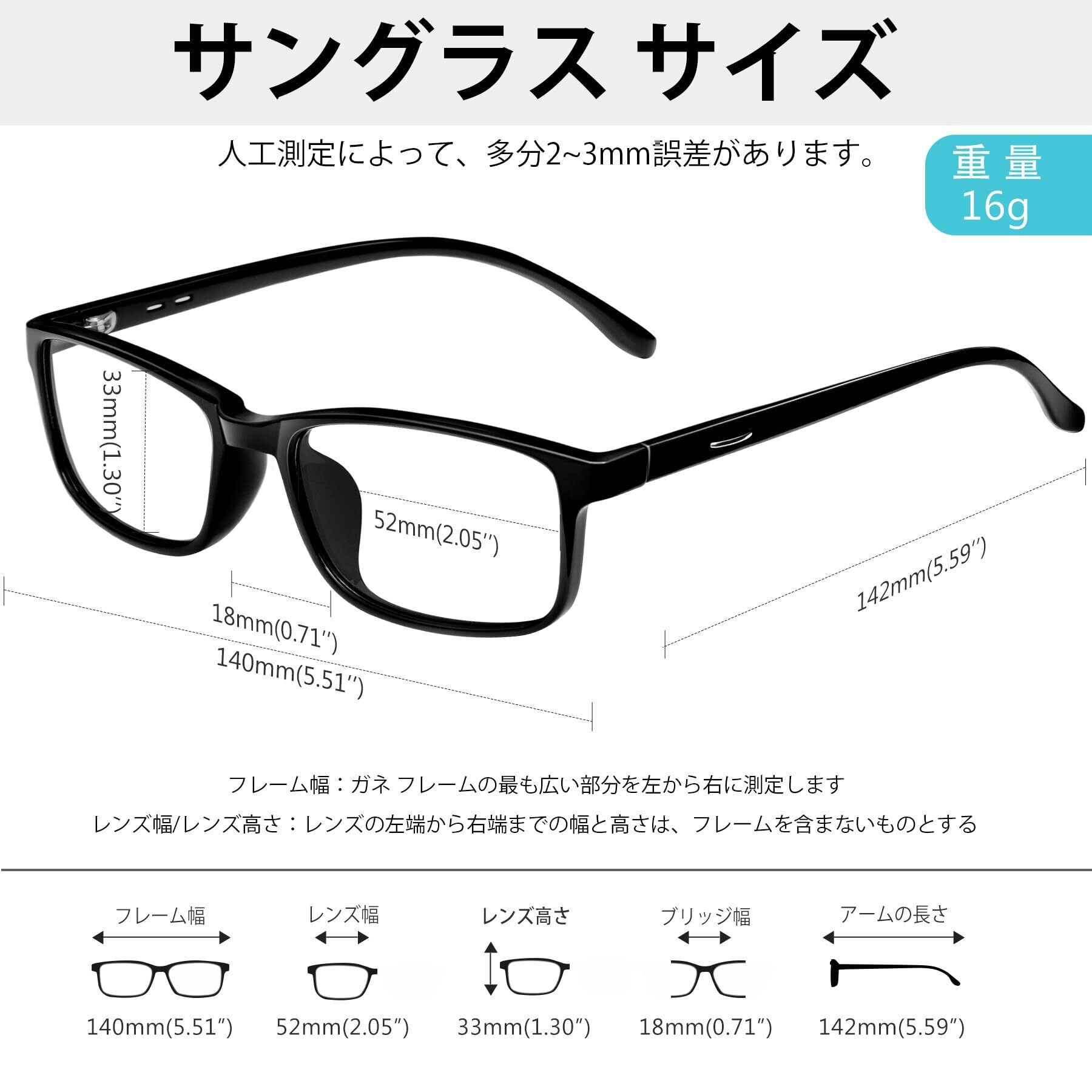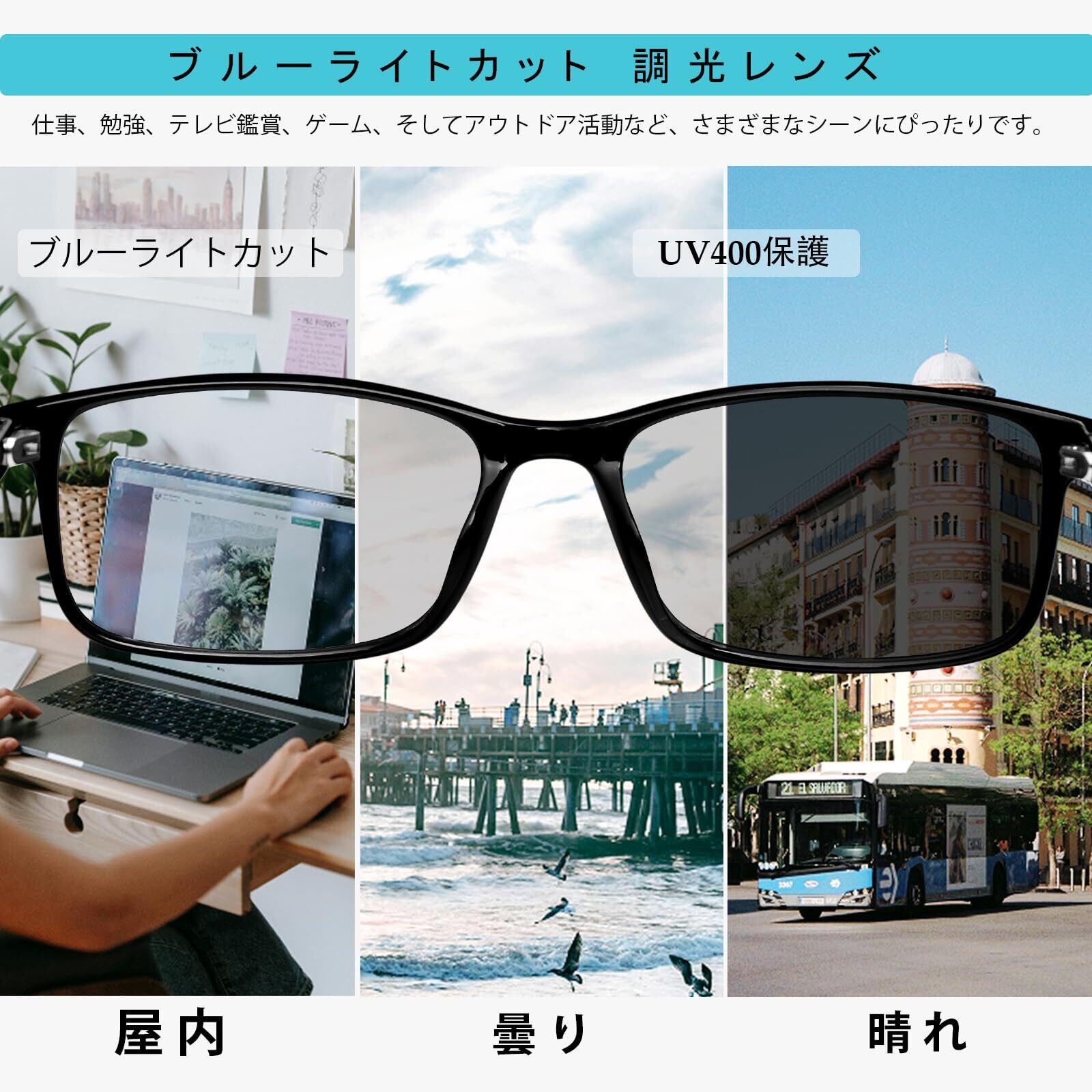 ブルーライトカット、UV400:UV400レンズを搭載し、紫外線を99%カット。目を有害な紫外線から保護。パソコンやスマホの有害なブルーライトを軽減。長時間の使用でも目の疲れを抑え、ダブルで目を守ります。室内ではPCメガネとして、屋外ではサングラスとして、1本で2役を果たします