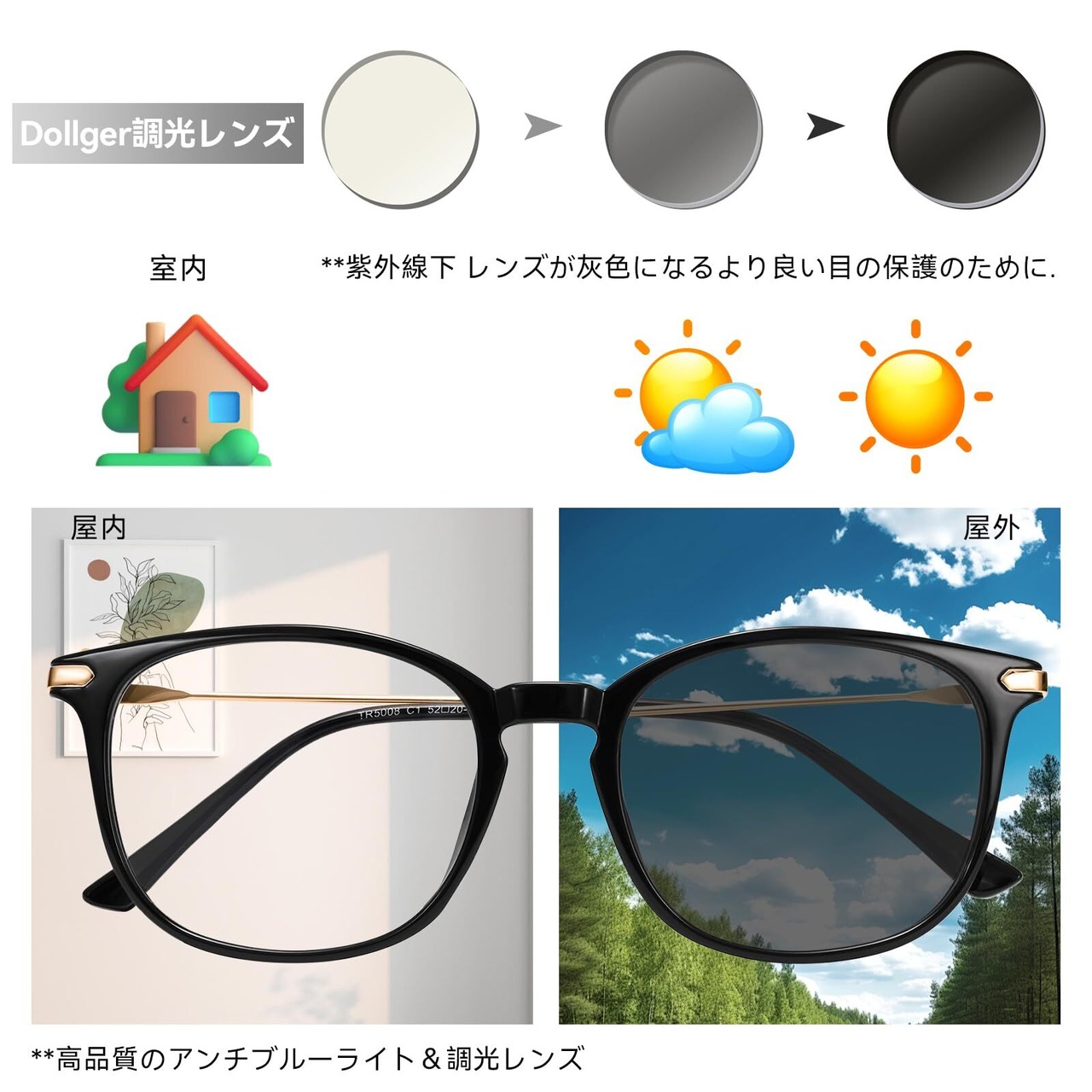 [Dollger] ブルーライトカット 伊達メガネ 調光メガネ 変色 パソコン用 丸い めがね UV 紫外線カット pc 男女兼用 超軽量