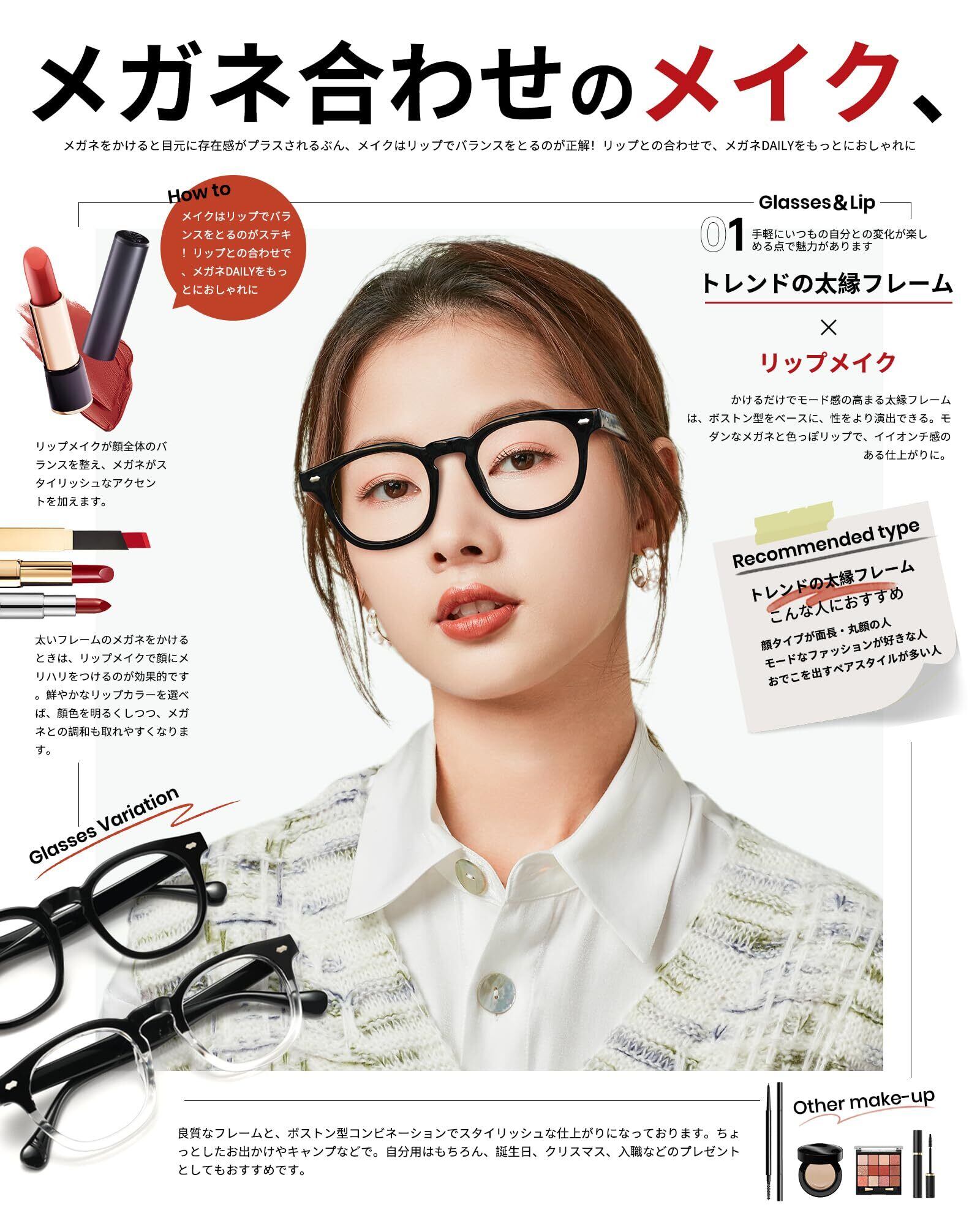 太セルフレーム:太セルの魅力といえば『顔が変わる』『個性をより演出できる』という点です。太セルフレームはボリュームがあり、その存在感が目元に力強さを与えてくれます。手軽にいつもの自分との変化が楽しめる点で魅力があります