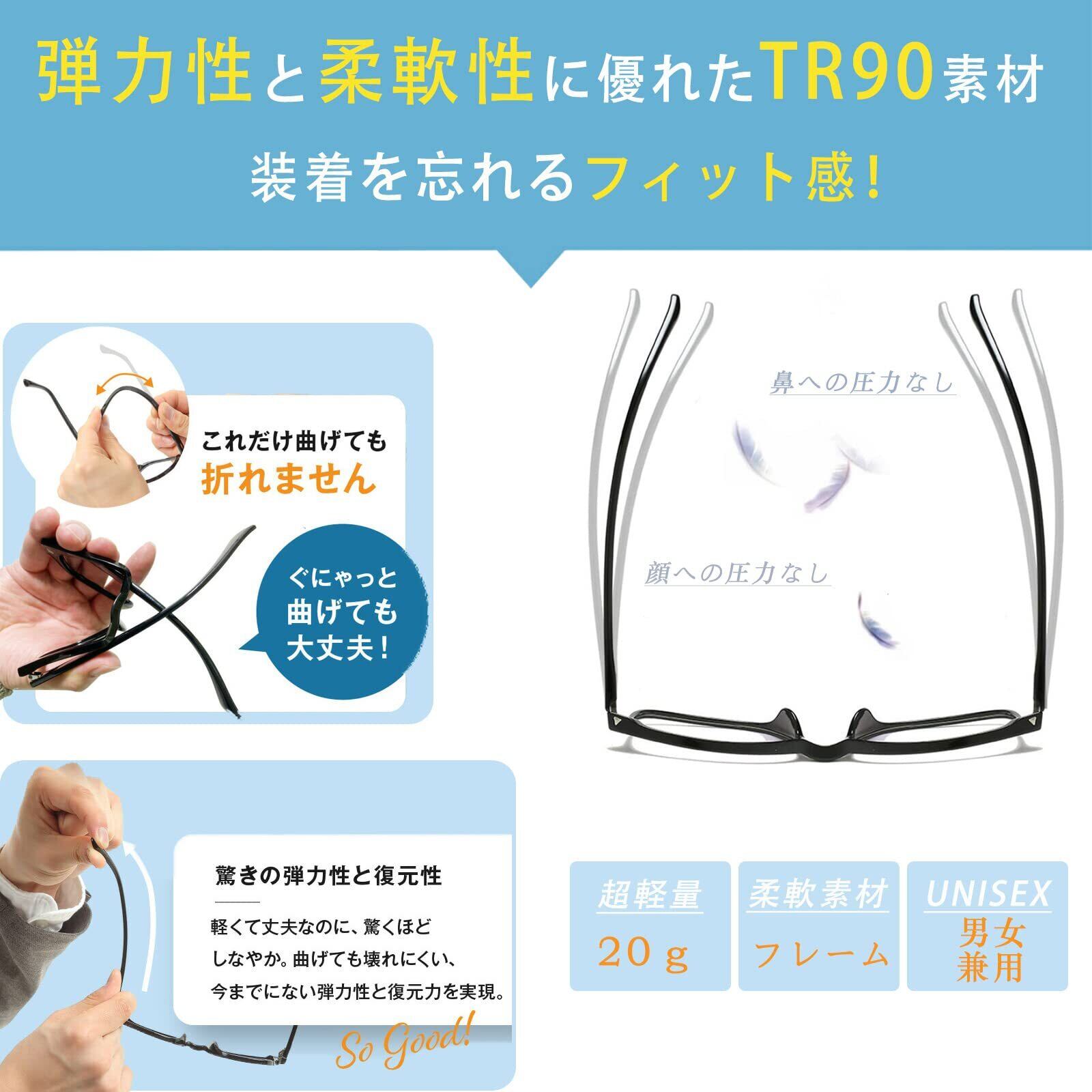 【超軽量・TR90素材による快適なフィット感 】 重さ20gと軽量で、とにかく軽い。軽いだけじゃなく、しなやかで壊れにくい。おしゃれにデザインされているパソコン用メガネです。日本人の顔幅に合わせて設計されており、ぴったりフィットするので快適につけられますよ。フレームが柔軟性に長けているため、顔にやさしくフィットします。レンズにほとんど色がついていないため、色が濁らずクリアな視界を保てるのが魅力。