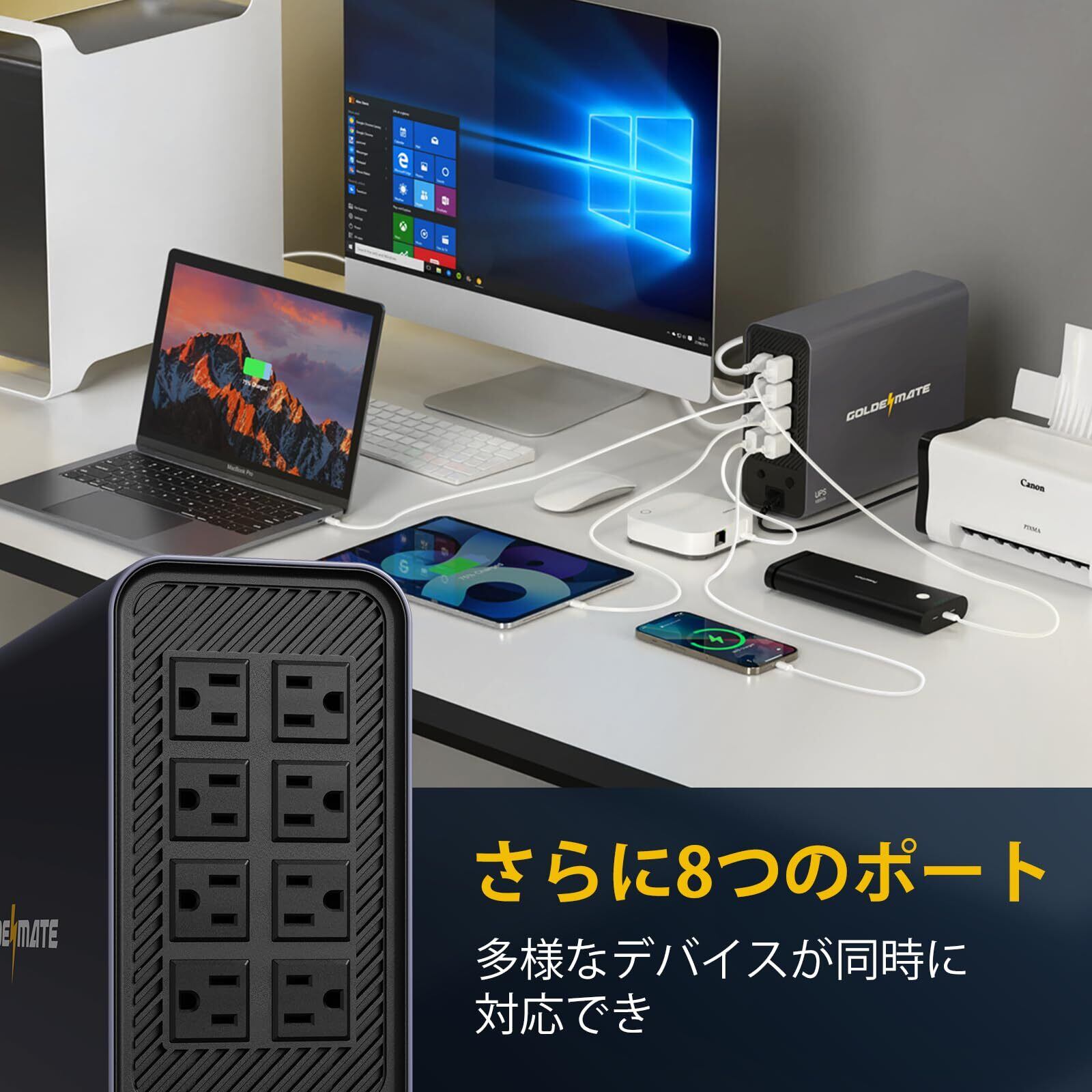 GOLDENMATE 無停電電源装置 UPS 1000VA Pro/800W リン酸鉄リチウムイオン電池採用 230Wh 常時商用給電 正弦波 ネットワーク機器 通信システム ホームオフィス 家庭用の高効率バックアップ電源 8ポート ダークグレー