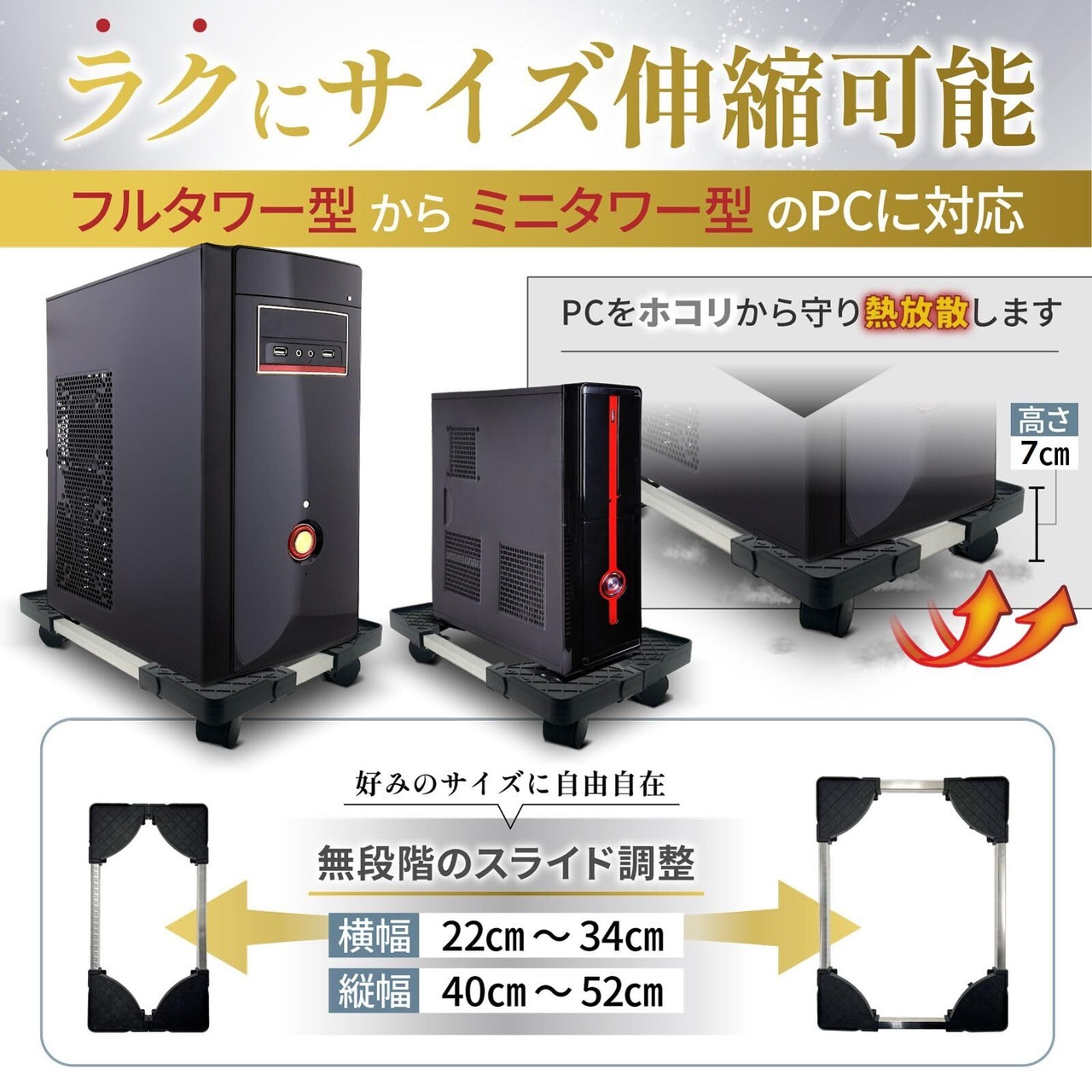 【無段階のスライド調整】フルタワー型からミニタワー型のPCに対応。 [こんな商品をお探しの方におすすめ]PC キャスター パソコンラック パソコン台 pcラック pc台 pcワゴン キャスター 台車 cpuワゴン